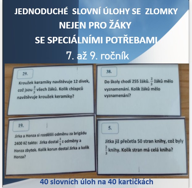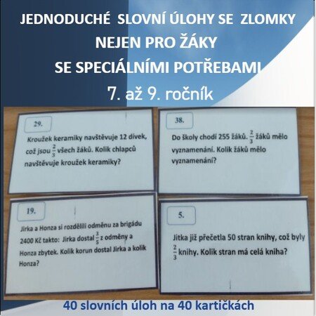 Sada přehledných kartiček (40 kartiček = 40 příkladů) se slovními úlohami a výsledky pomáhá žákům 7. – 9. třídy lépe porozumět zlomkům v praktických situacích. Materiál není navržený jen pro žáky se speciálními vzdělávacími potřebami i pro ty, kteří potřebují více času, tréninku a jistoty.