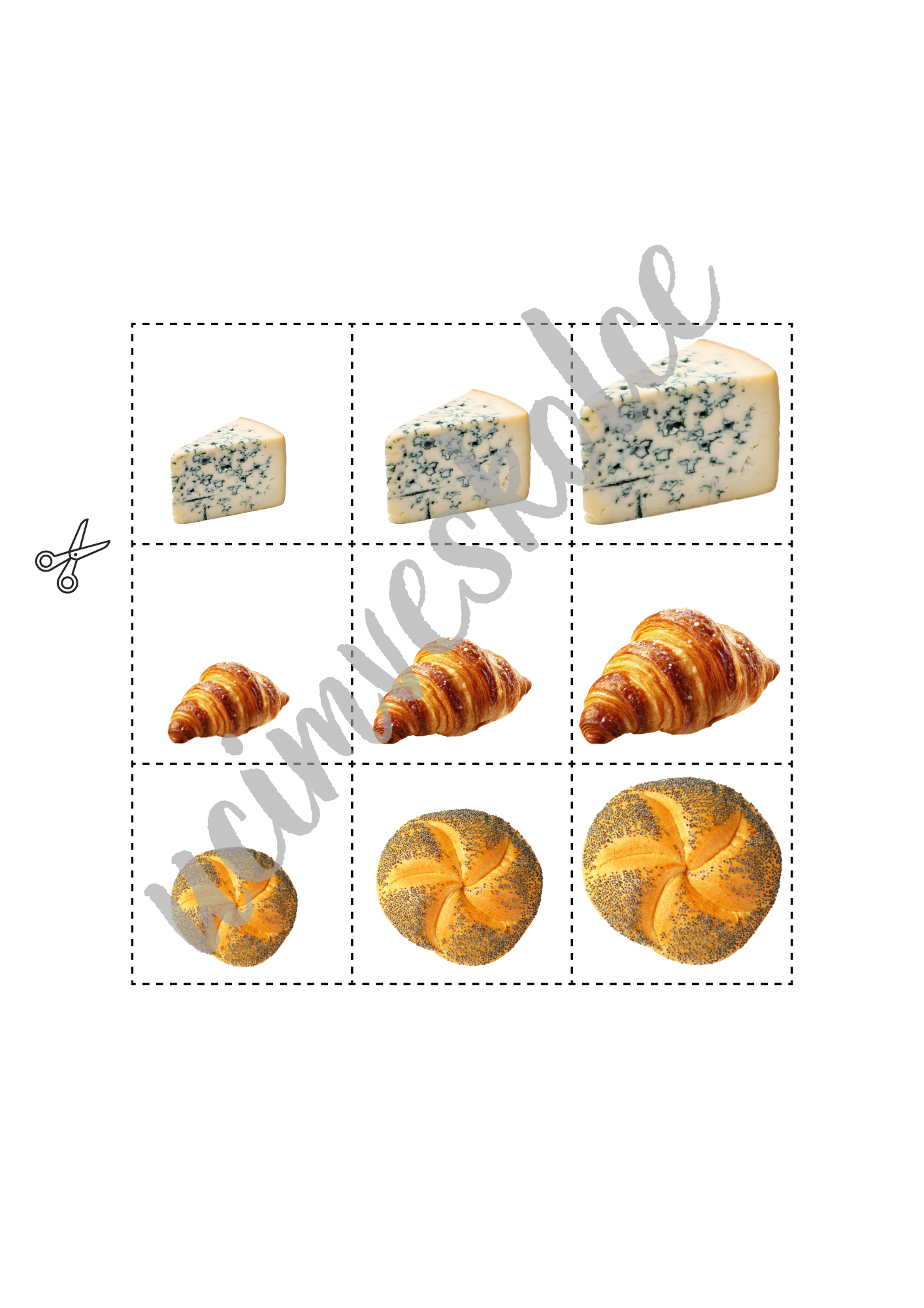 Tematický soubor "JÍDLO - řazení dle velikosti"obsahuje 10 tabulek + 90 kartiček s obrázky určených k rozvoji matematické pregramotnosti.