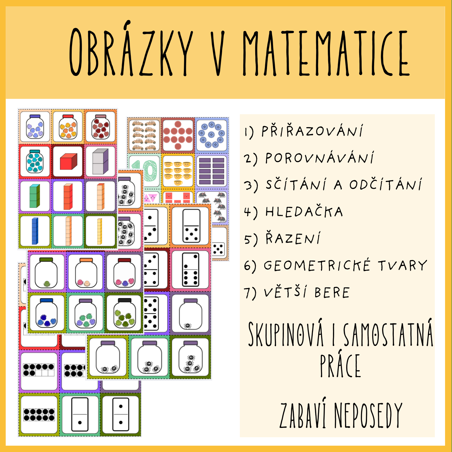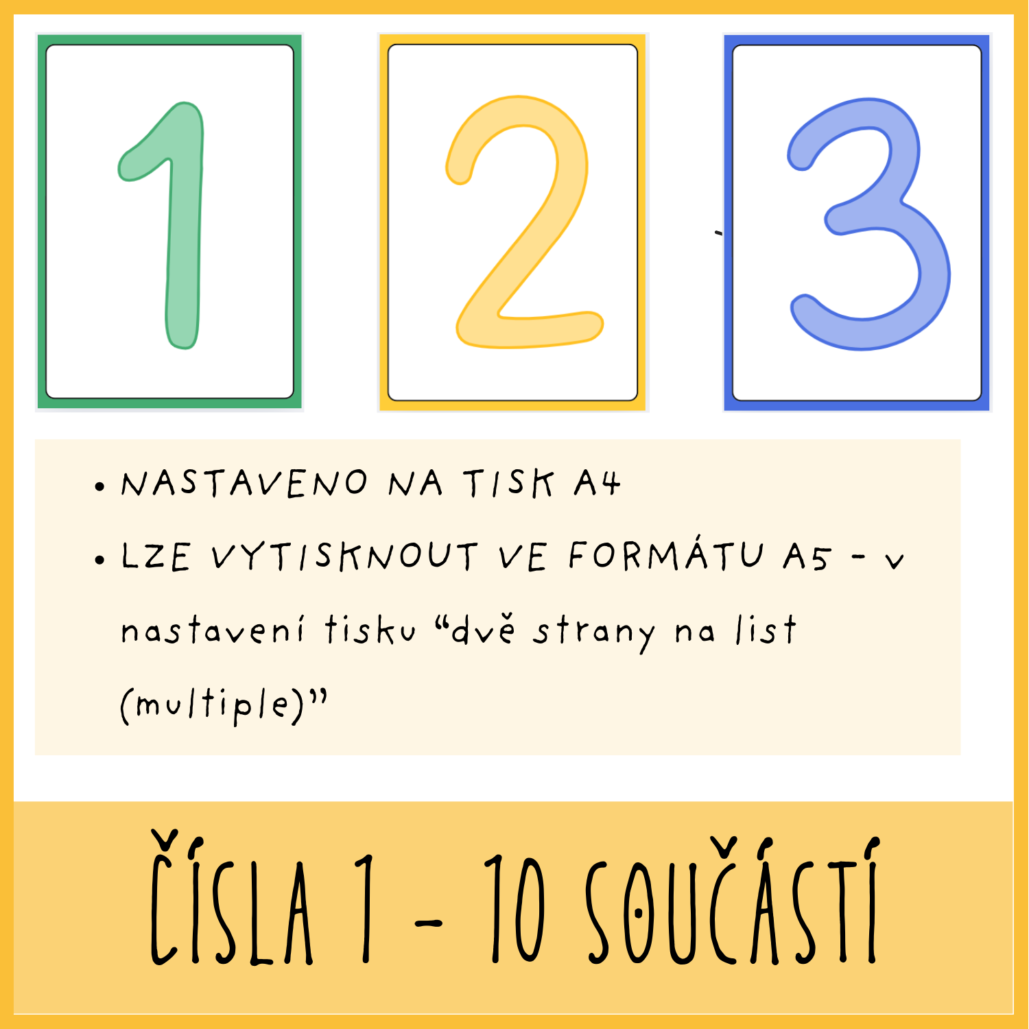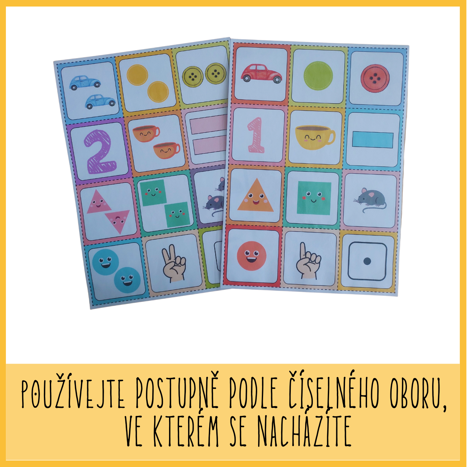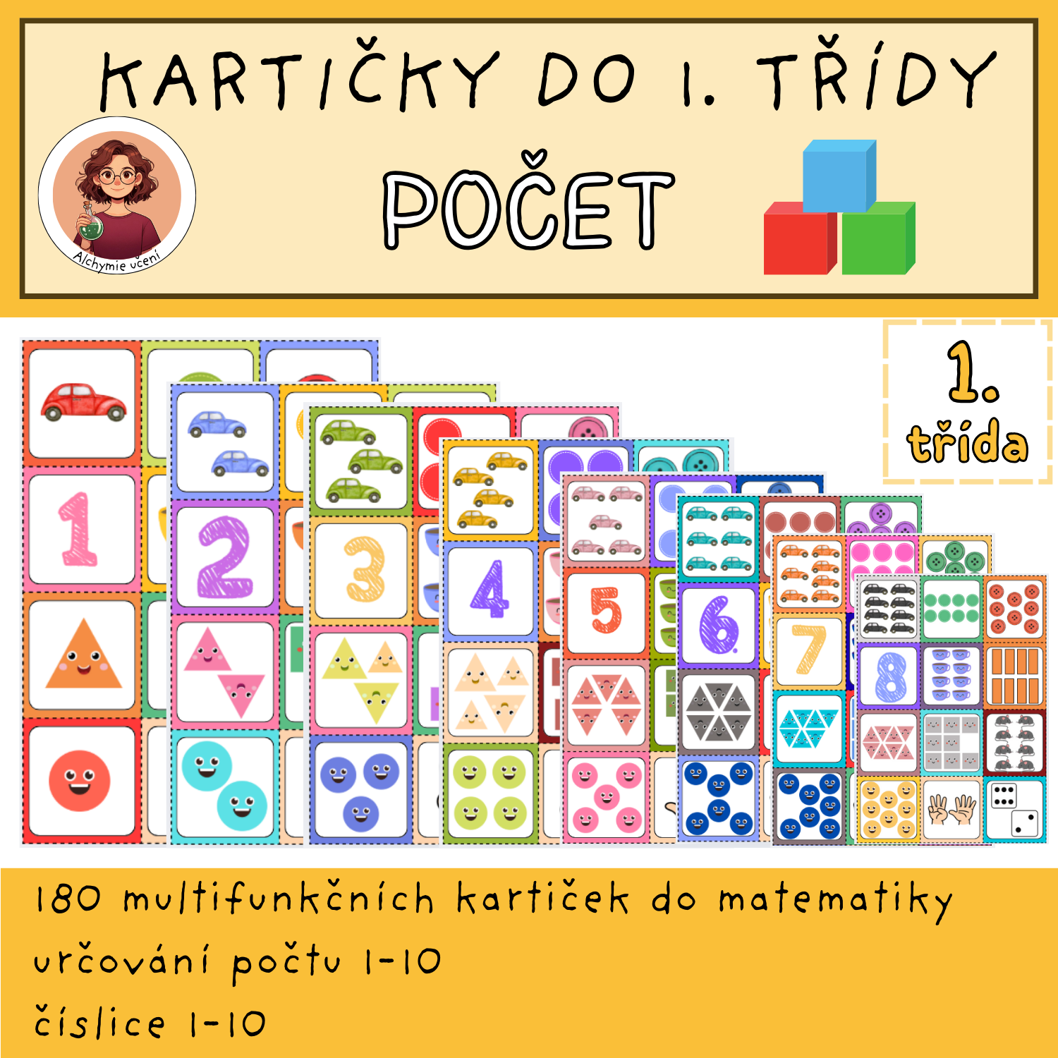 Soubor obsahuje 180 kartiček s obrázky znázorňující počet 1-10. Celkem 15 stran barevných kartiček. Součástí jsou i číslice 1-10.