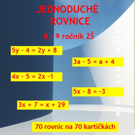 Tento materiál (příkladů na 70 kartičkách) je vytvořený s ohledem na žáky 8.– 9. tříd, kteří při práci s rovnicemi narážejí na obtíže nebo potřebují více času, názornosti a podpory. Kartičky jsou přehledně zpracované a vizuálně jednoduché – žádné zbytečné rušivé prvky, jen jasné zadání a možnost okamžité kontroly správného výsledku.