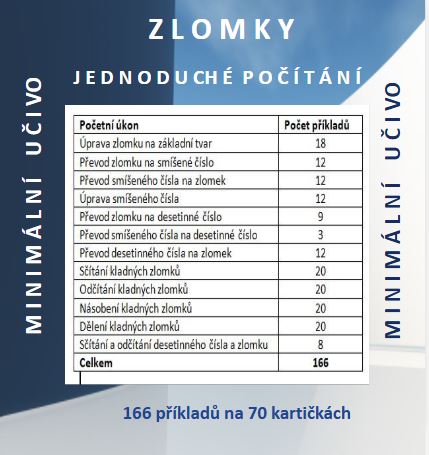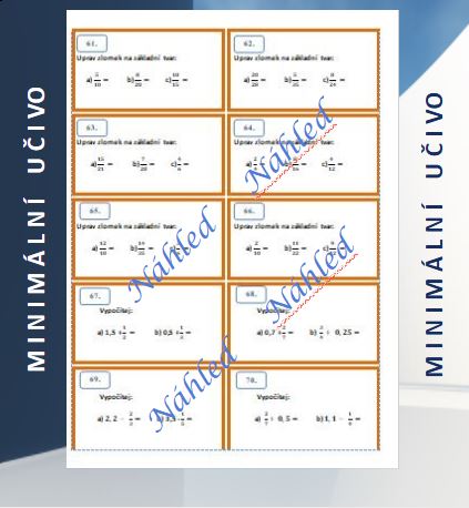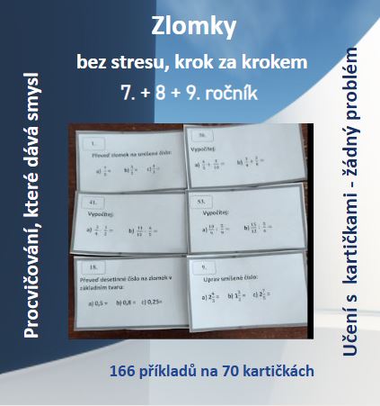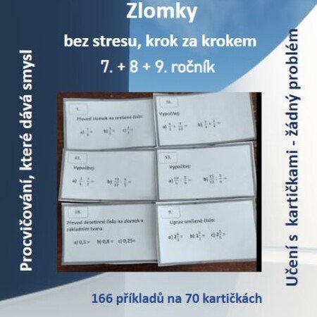 Tento materiál (136 příkladů na 70 kartičkách) je vytvořený s ohledem na žáky 7.– 9. tříd, kteří při práci se zlomky narážejí na obtíže nebo potřebují více času, názornosti a podpory. Kartičky jsou přehledně zpracované a vizuálně jednoduché – žádné zbytečné rušivé prvky, jen jasné zadání a možnost okamžité kontroly správného výsledku.