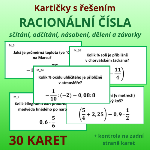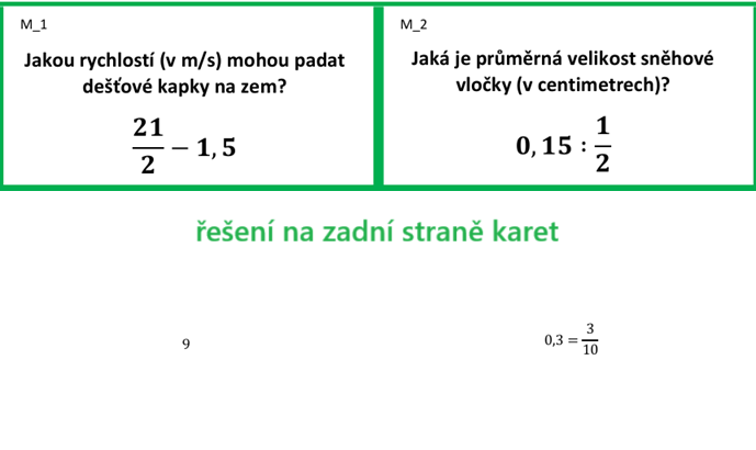 - Karty je možné využít ale i tak, že je vytisknete bez řešení, rozmístíte karty po třídě/chodbě a necháte žáky řešit úlohy ve skupinách (skupiny a pravidla, případně role žáků, doporučuji uzpůsobit dané třídě).