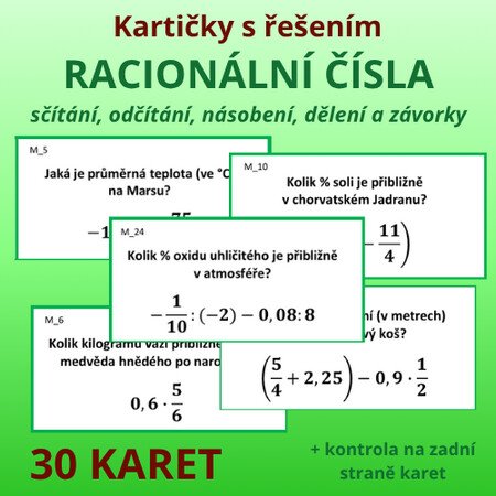 Popis aktivity: Aktivita obsahuje 30 karet s otázkami (zajímavosti ze světa). Odpověď na otázku je vždy číselná, je napsaná pomocí příkladu s racionálními čísly k vypočítání (sčítání, odčítání, násobení, dělení, závorky). Na druhé straně karty je uvedeno správné řešení (číselná odpověď na otázku).