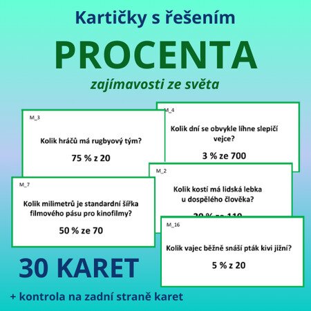 Popis aktivity: Aktivita obsahuje 30 karet s otázkou ohledně zvířat, sportu, zeměpisu apod. Odpověď na otázku je vždy číselná, je napsaná pomocí příkladu (např. 3 % ze 600). Na druhé straně karty je řešení (číselná odpověď).