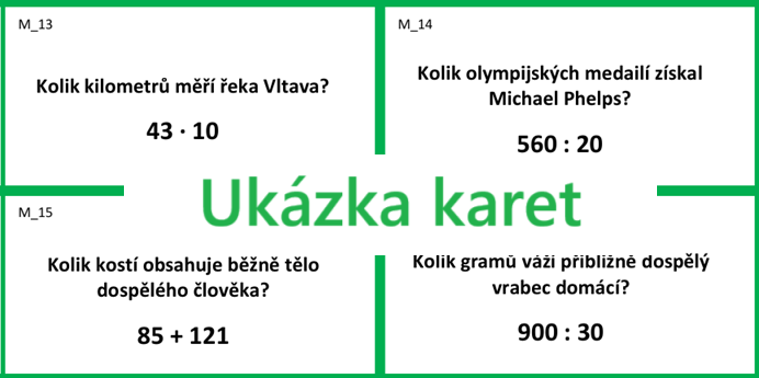 - Karty je možné využít ale i tak, že je vytisknete bez řešení, rozmístíte karty po třídě/chodbě a necháte žáky řešit úlohy ve skupinách (skupiny a pravidla, případně role žáků, doporučuji uzpůsobit dané třídě).