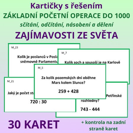 Popis aktivity: Aktivita obsahuje 30 karet s otázkou ohledně zvířat, sportu, ČR, vesmíru apod. Odpověď na otázku je vždy číselná, je napsaná pomocí příkladu (základní početní operace do 1000) k vypočítání. Na druhé straně karty je uvedeno správné řešení (číselná odpověď na otázku).