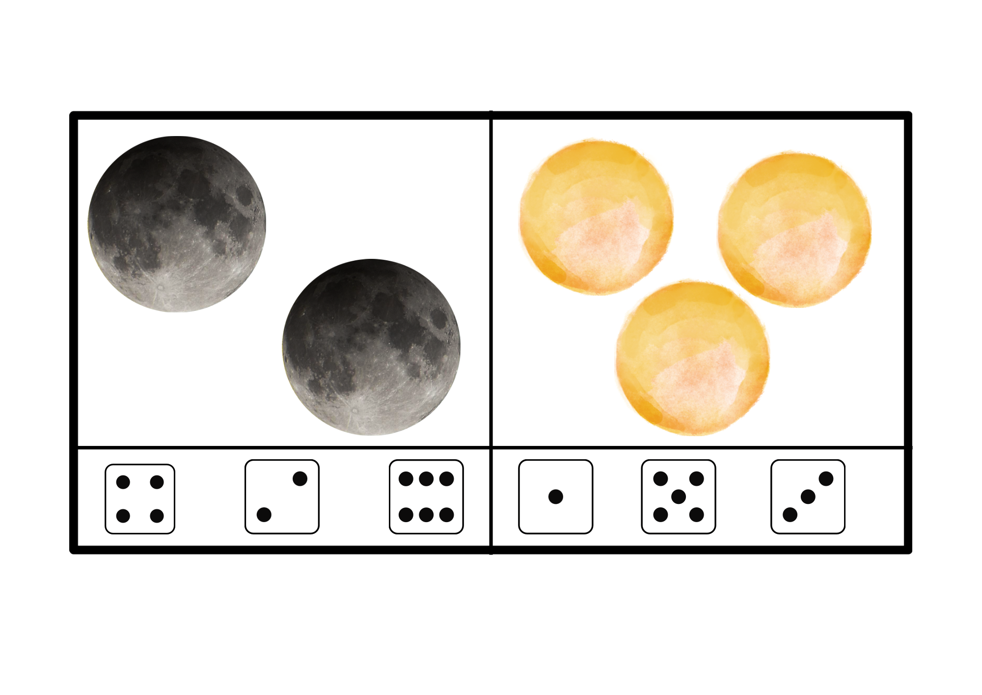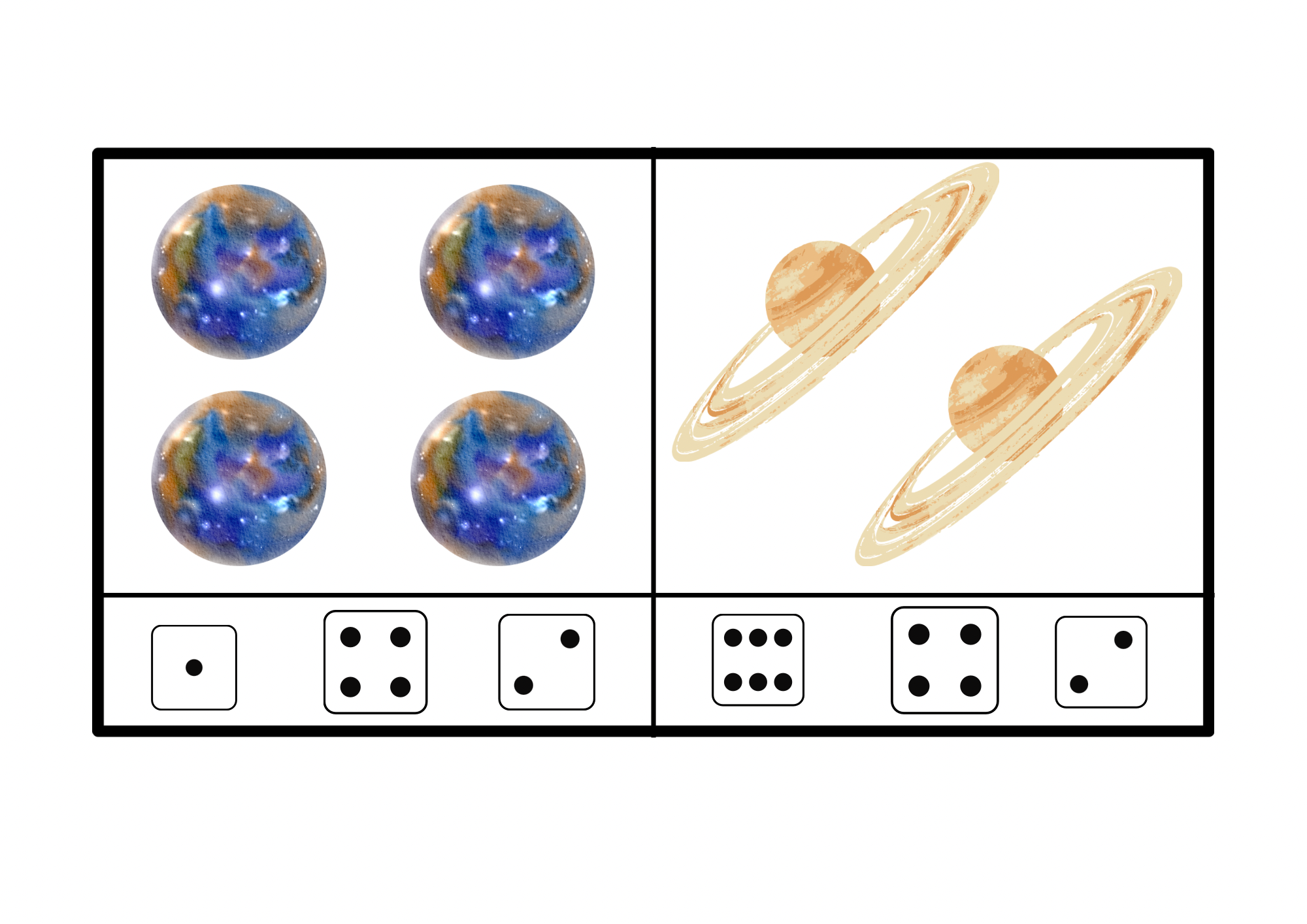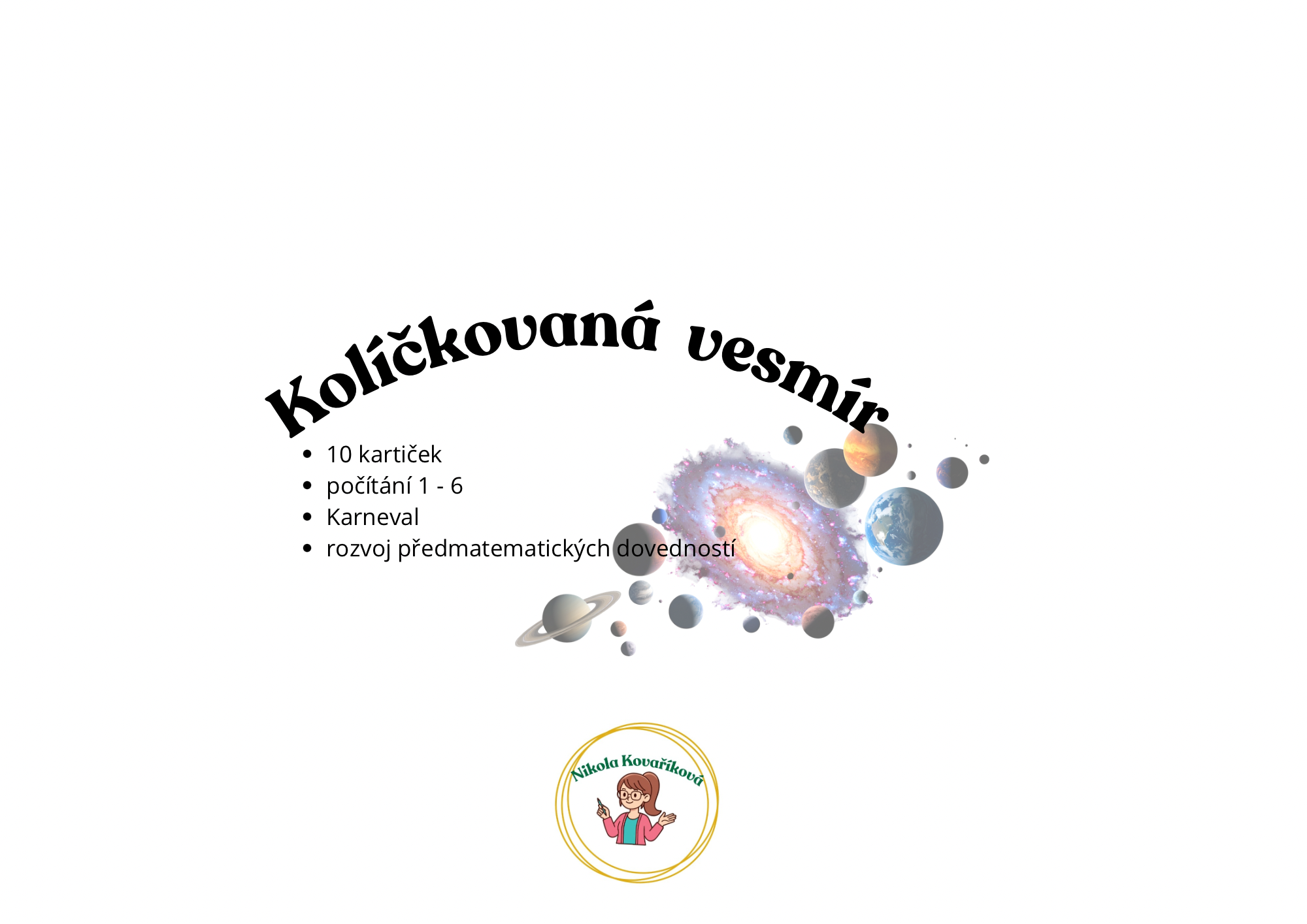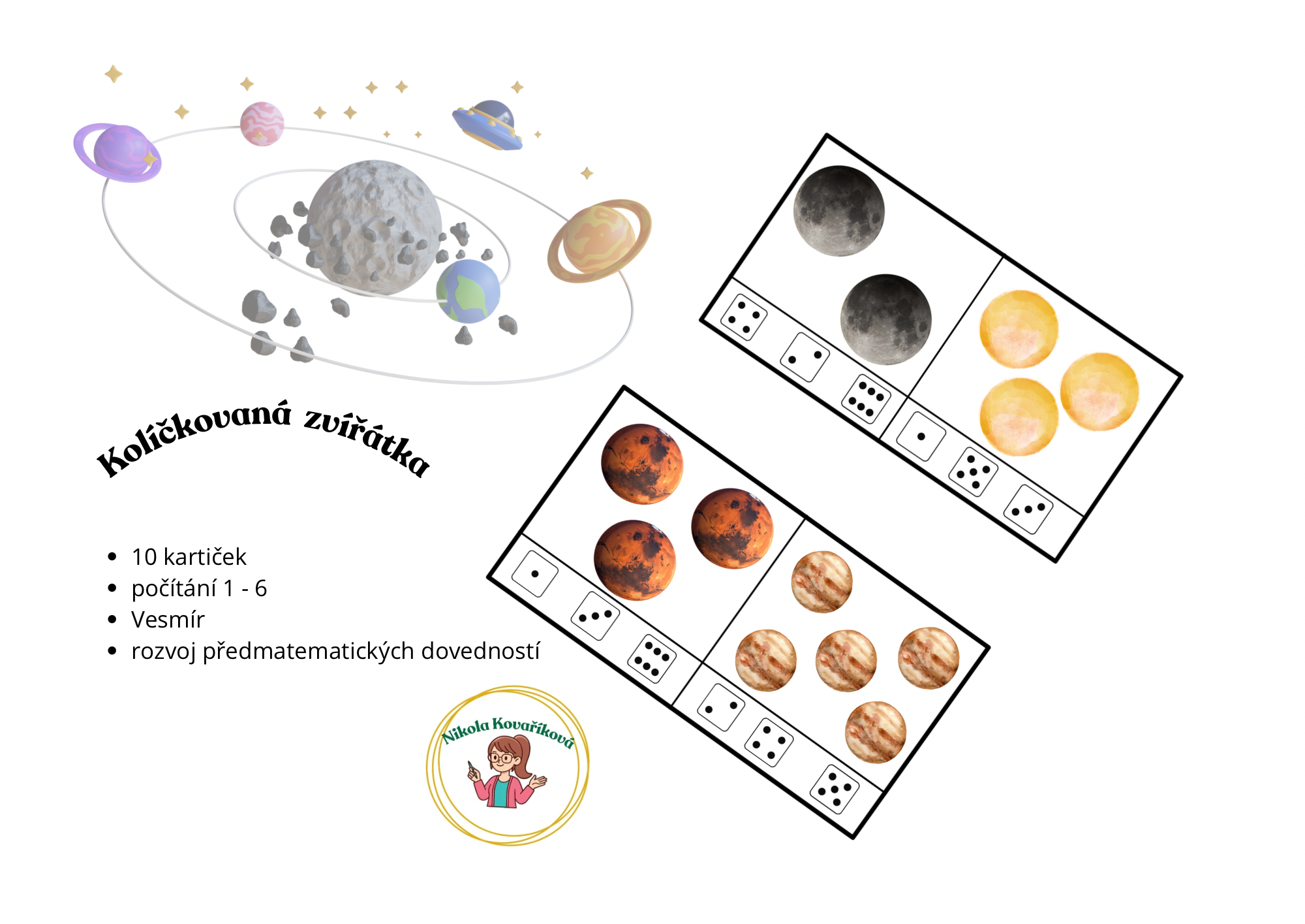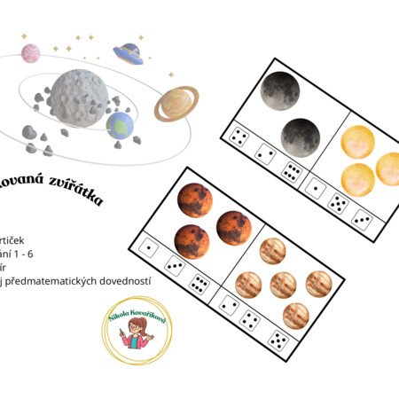 Soubor obsahuje 10 karet s tematikou Vesmír na procvičení předmatematických dovedností a to konkrétně počítání 1-6.