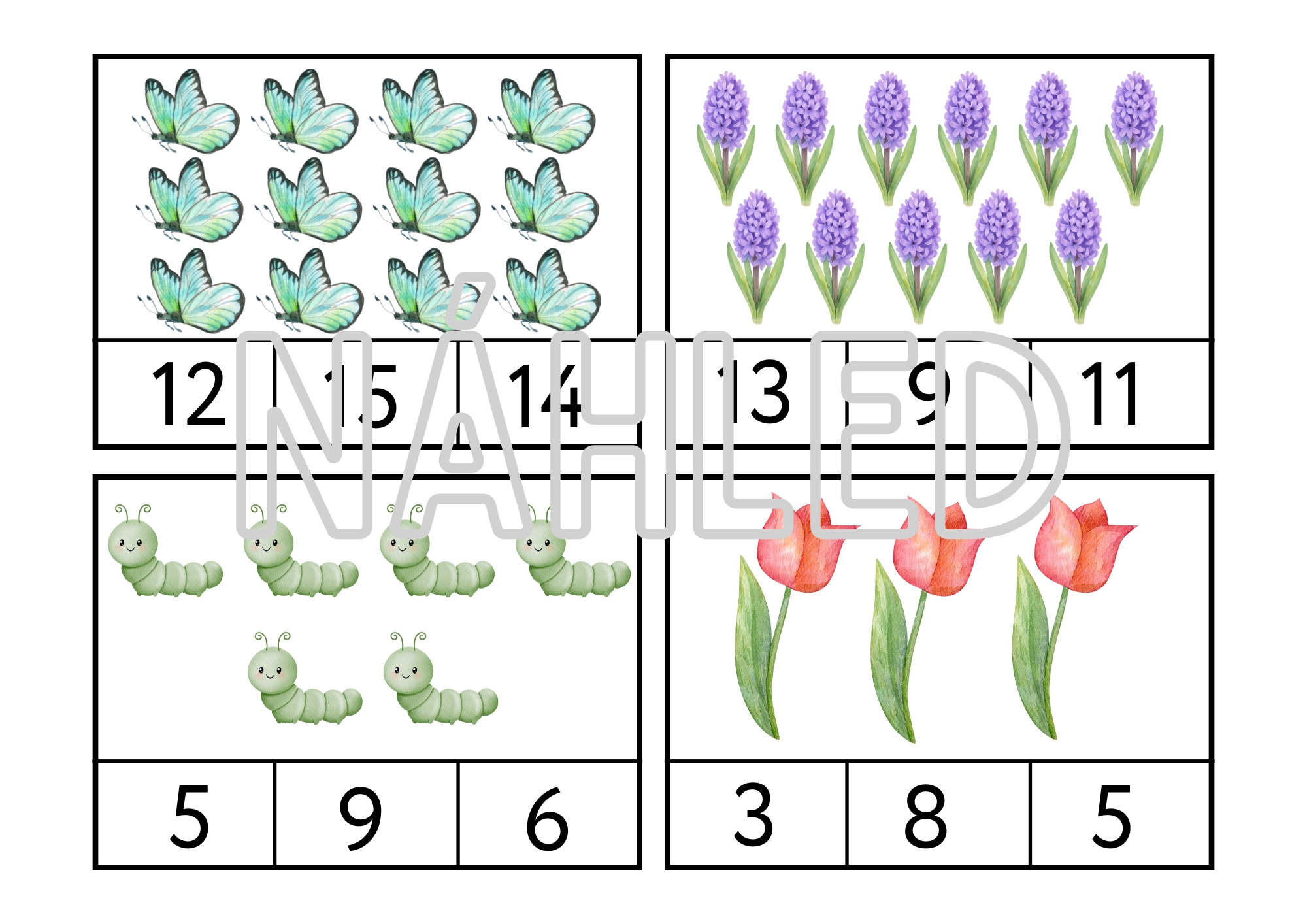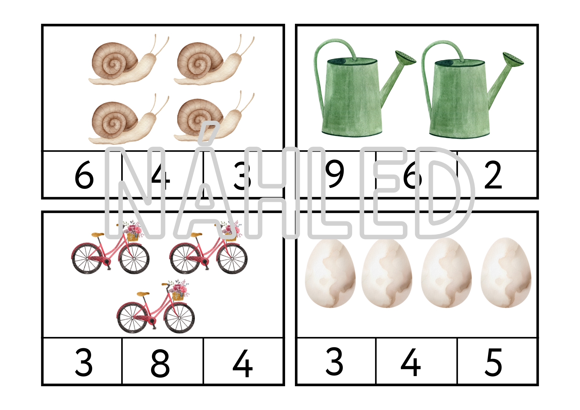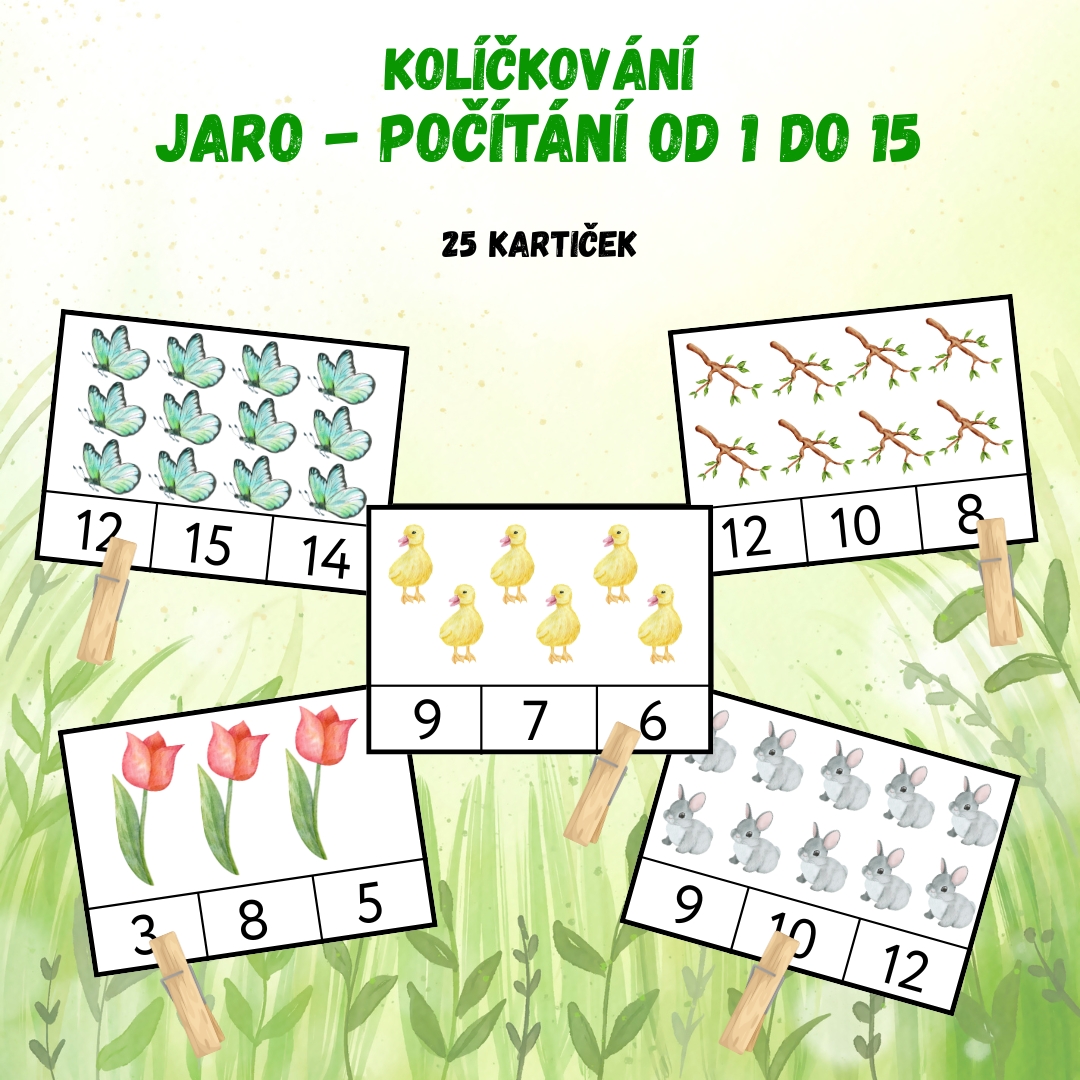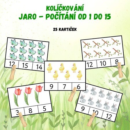 Sada obsahuje 25 karet s jarními obrázky - děti na nich počítají předměty (1–15) a pomocí kolíčků, kamínků nebo bambulek označují správné číslo.