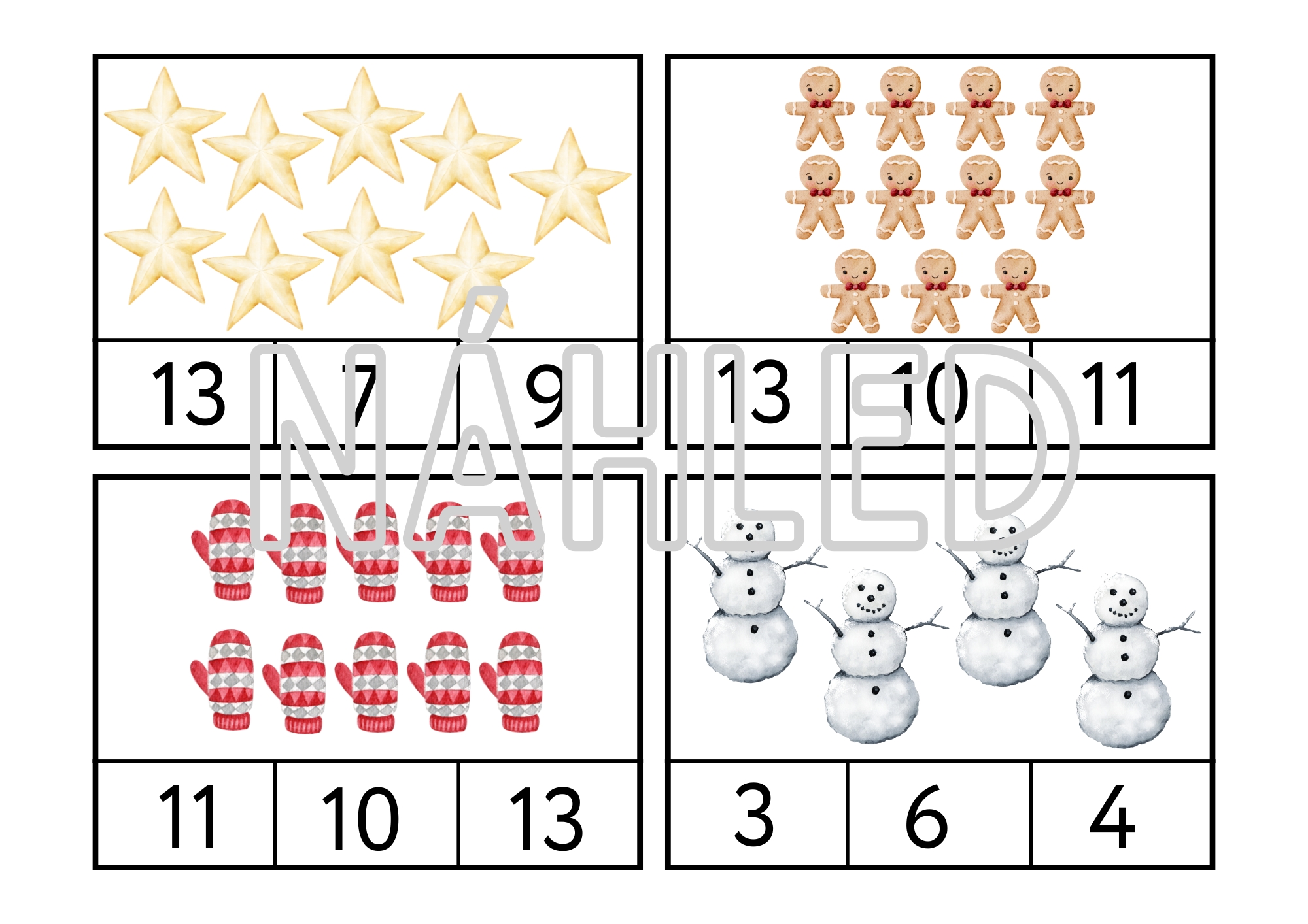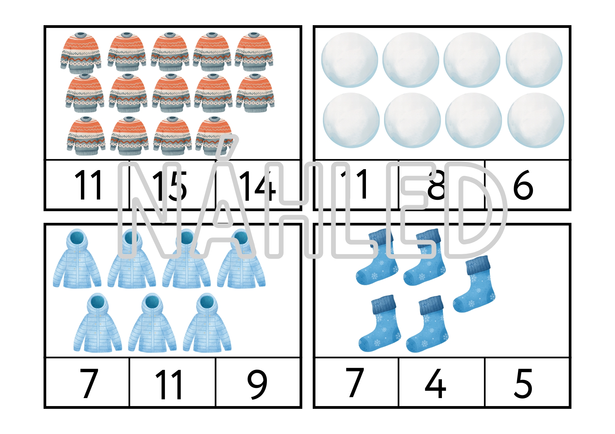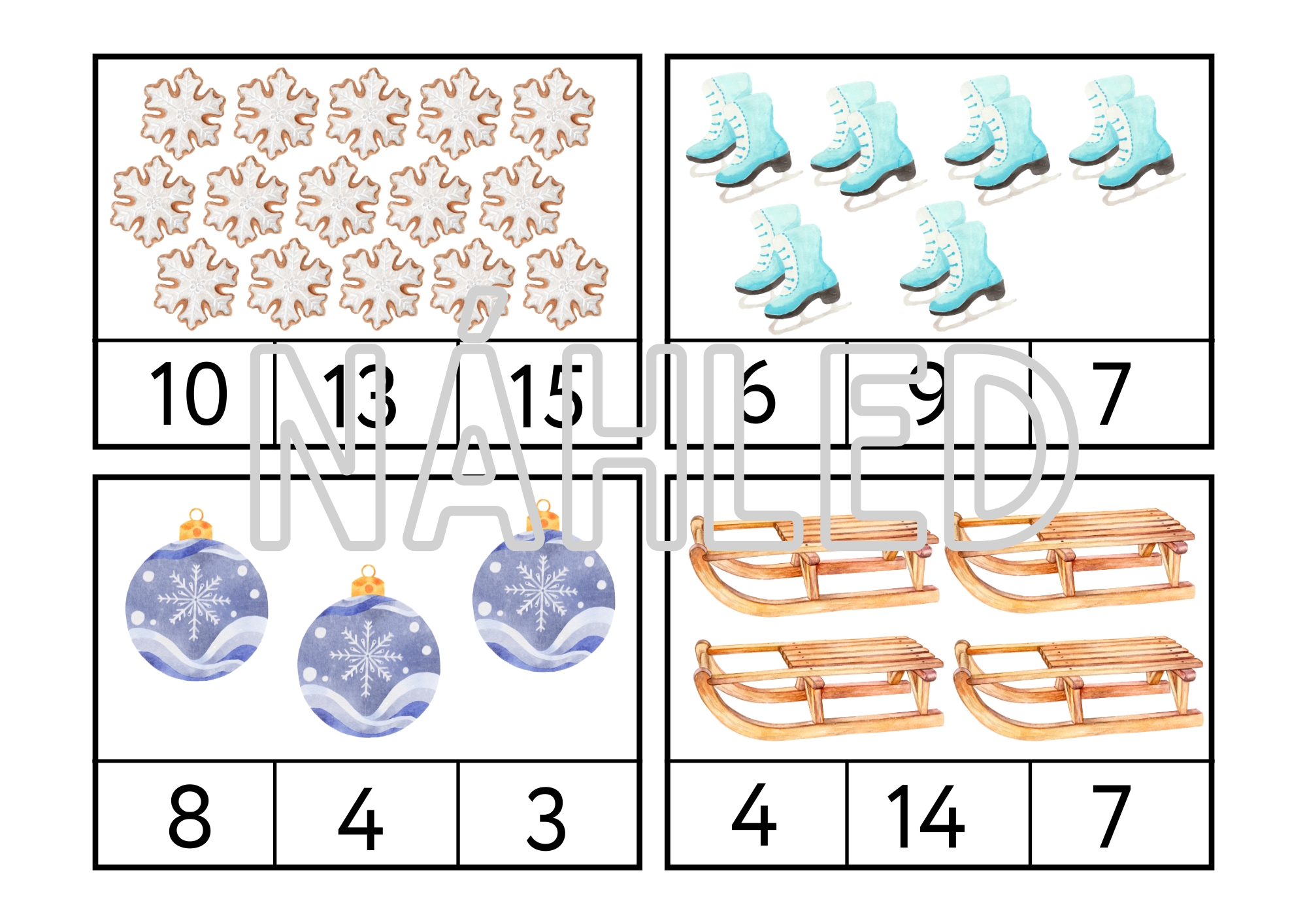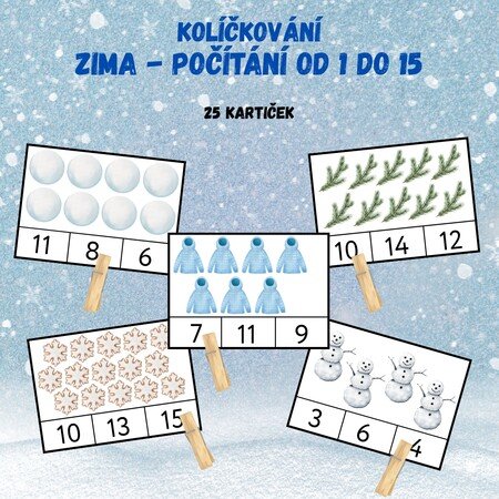 Sada obsahuje 25 karet se zimními obrázky - děti na nich počítají předměty (1–15) a pomocí kolíčků, kamínků nebo bambulek označují správné číslo.