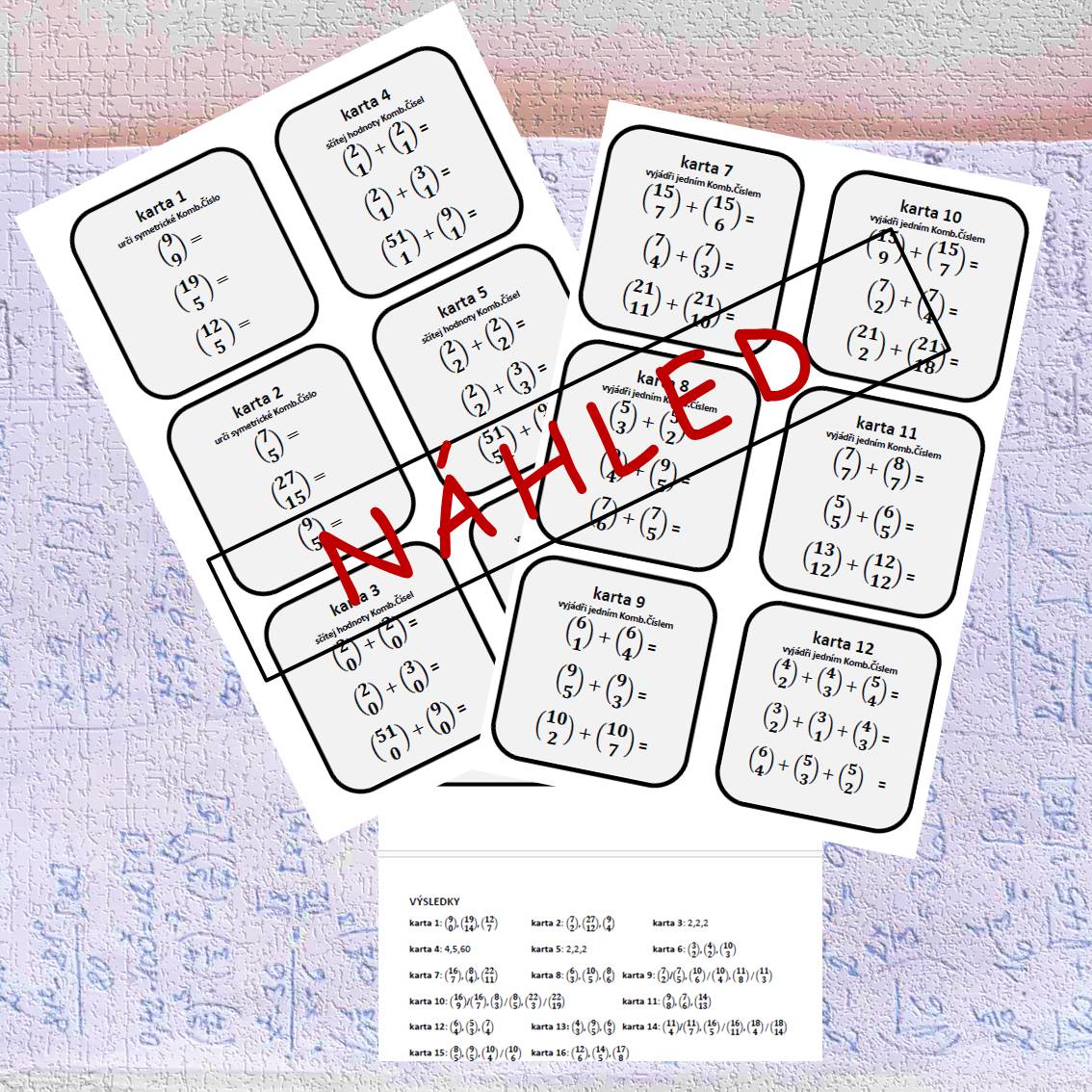 Na dalších třech stranách je 18 karet každá se třemi příklady. Na pořadí karet a na kartě samotné se postupně zvyšuje náročnost řešení. Každá karta se třemi příklady se věnuje stejné/podobné problematice. Poslední strana obsahuje výsledky.
