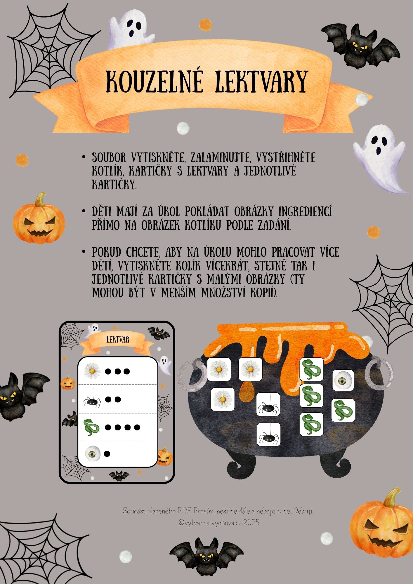 Soubor obsahuje 20 kartiček lektvarů, 70 malých obrázků (14 rozdílných obrázků, každá po 5 kusech) a 1 velký kotlík. Dále seznam ingrediencí, úvodní text, jak s materriálem pracovat.
