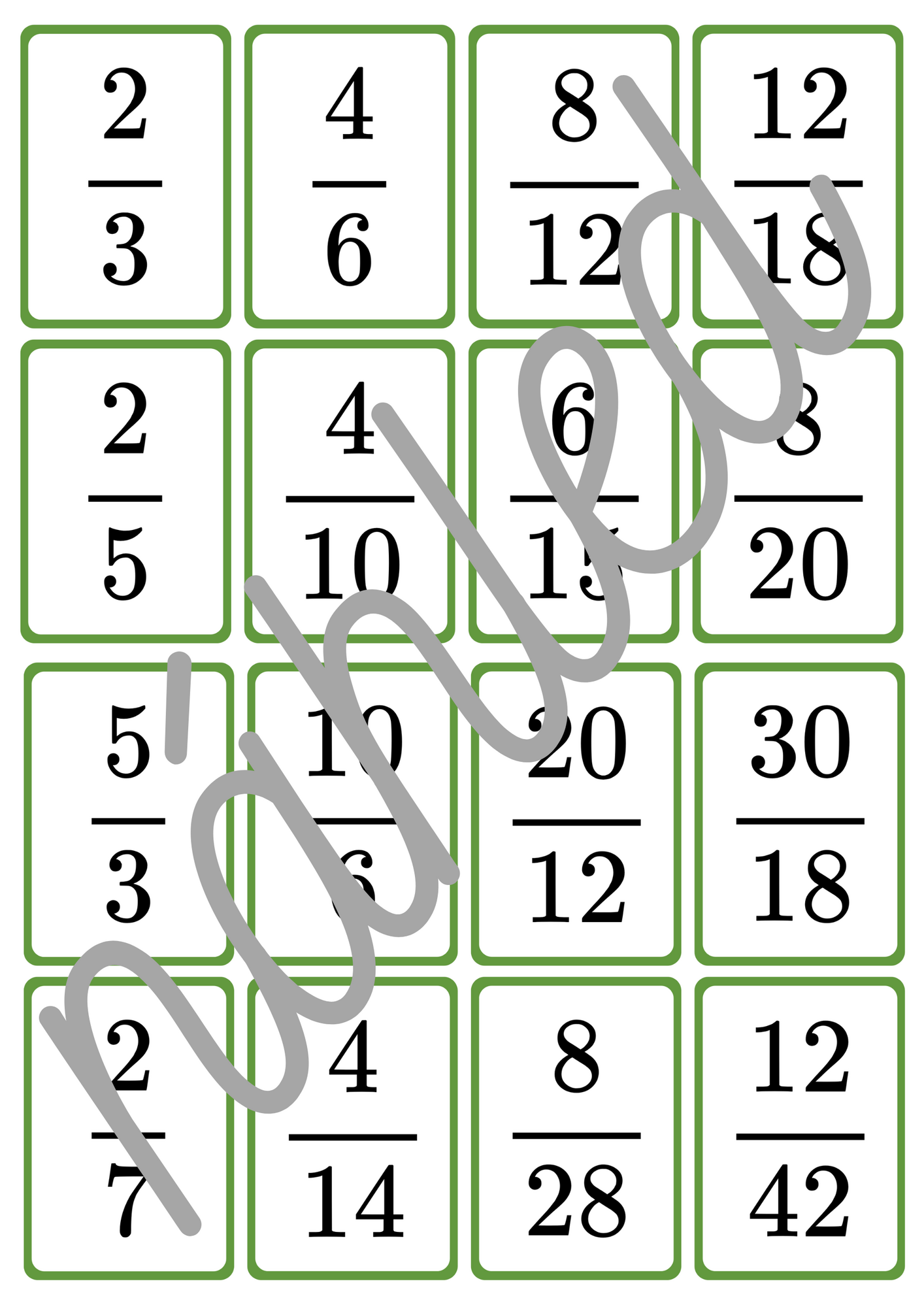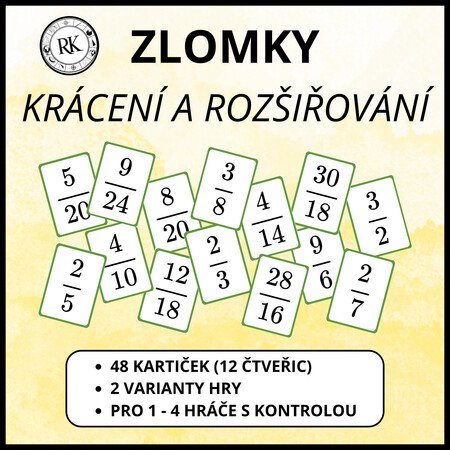 Vzdělávací materiál obsahuje kartičky se zlomky vhodné k procvičování rozšiřování nebo krácení zlomků. Doporučuji materiál vytisknout, zalaminovat a rozstříhat (vznikne 48 kartiček).