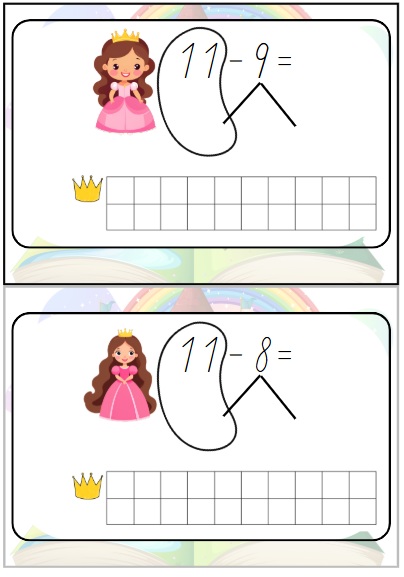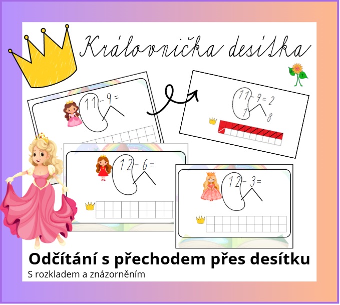 Karty jsou určené pro nácvik odčítání s přechodem přes desítku. Základem je hledání "královničky desítky" , která nám s odčítáním pomůže. Řešení mohou děti znázornit do čtvercové sítě. Z druhé strany je přiloženo řešení pro rychlou kontrolu.