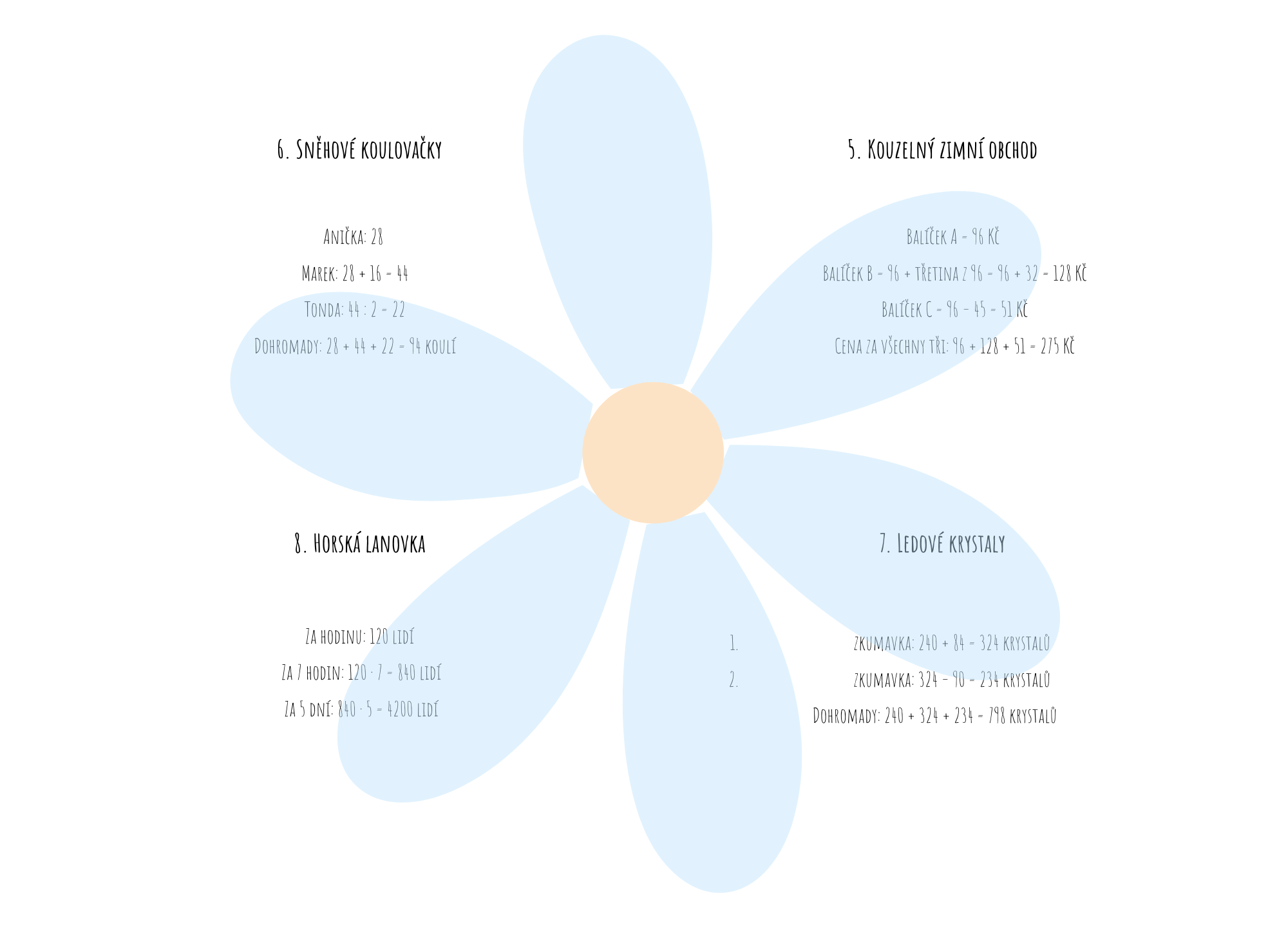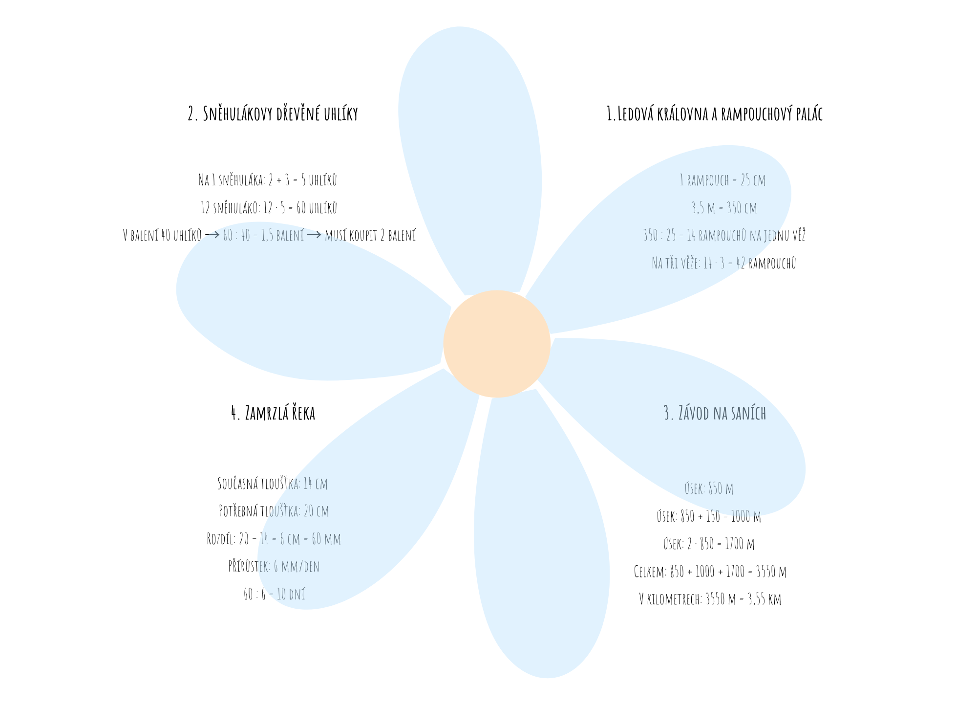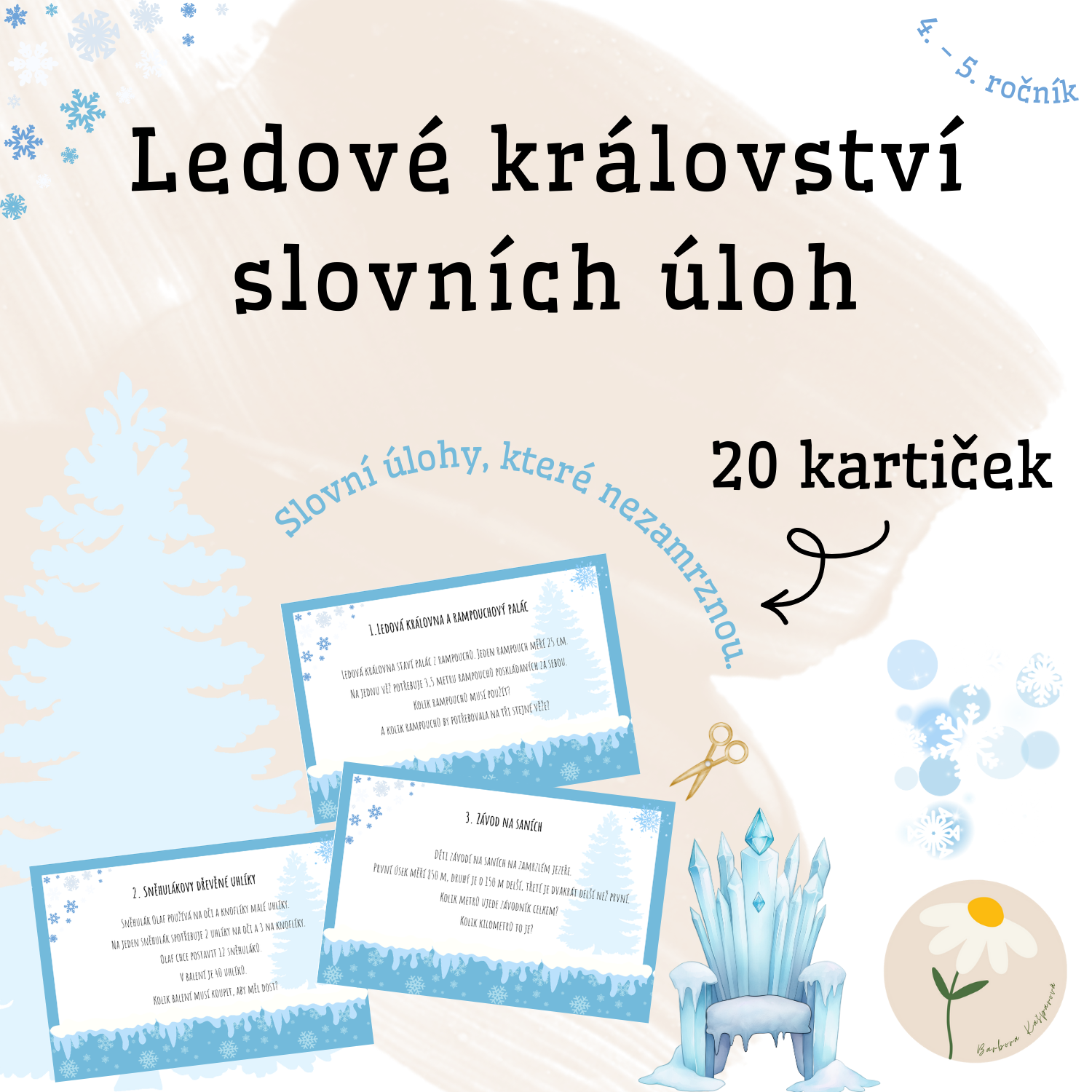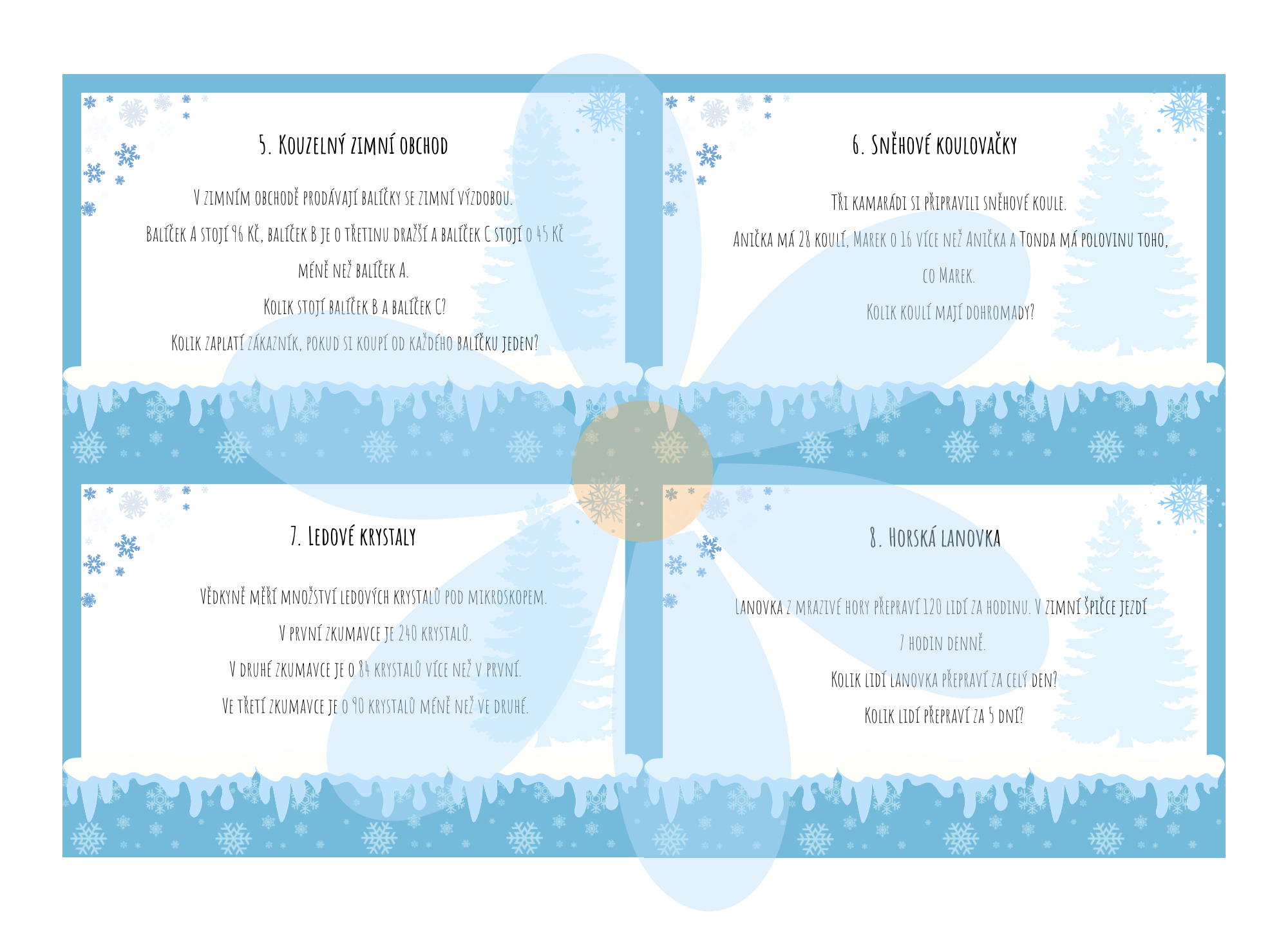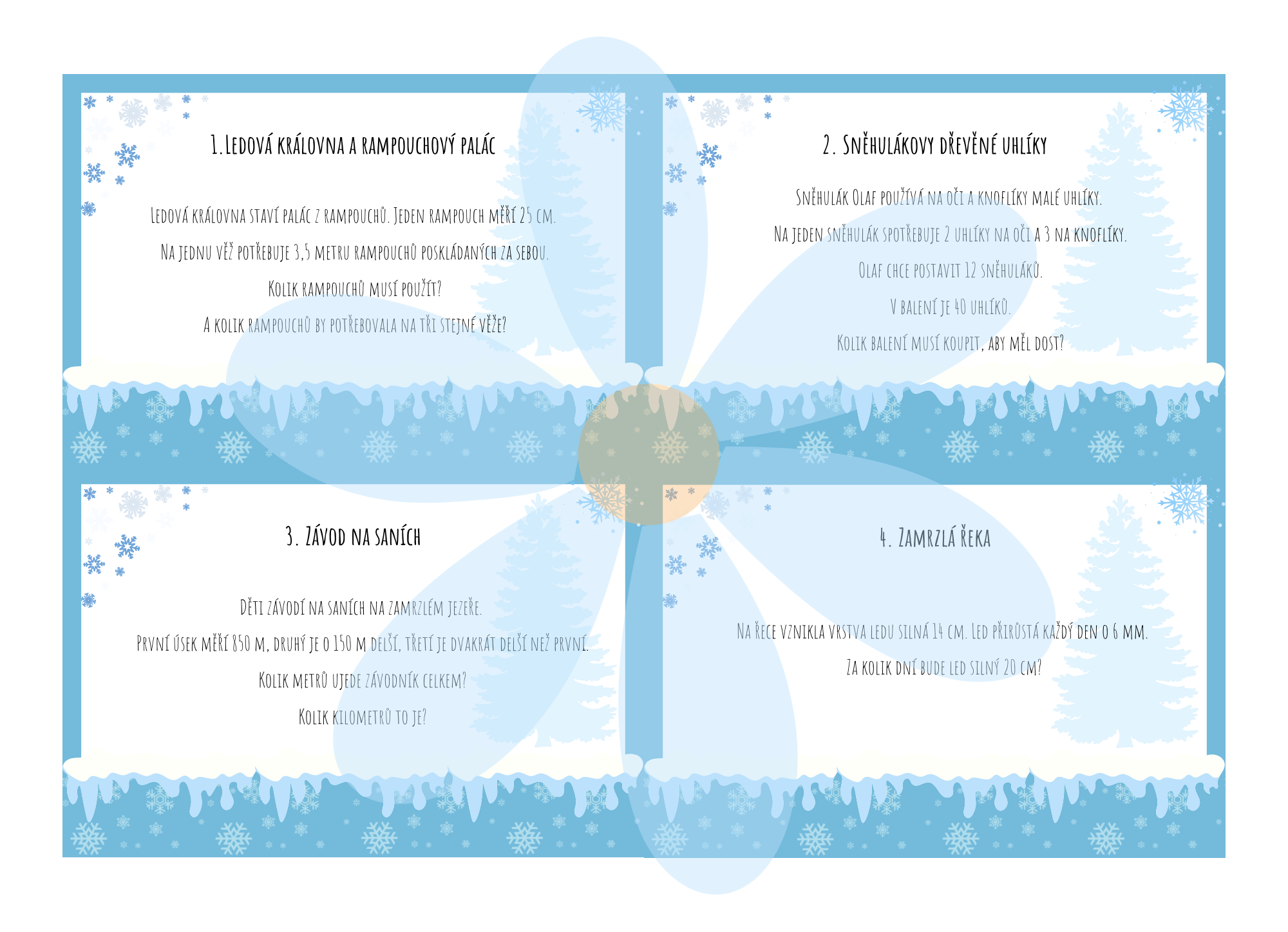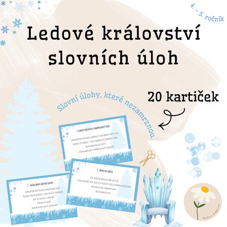 Tento materiál je určen pro žáky 5. ročníku základní školy a nabízí sadu zimně laděných slovních úloh, které rozvíjejí matematické myšlení v hravém a motivujícím kontextu. Úlohy jsou zasazeny do mrazivých příběhů ze světa sněhu, ledu, sněhuláků a ledového království, díky čemuž podporují zájem žáků o řešení a práci s textem.