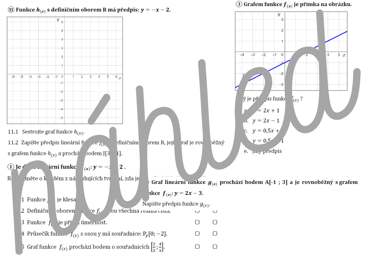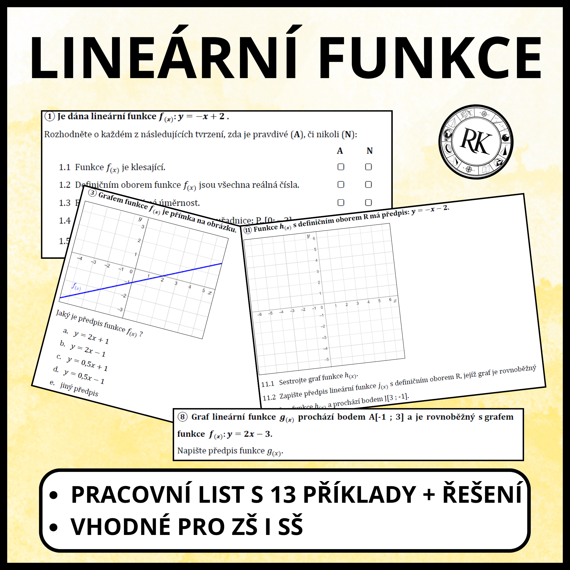 Vzdělávací materiál obsahuje 13 úloh s podúkoly (včetně výsledků), které slouží k procvičení tématu lineární funkce. Pracovní listy je možné použít jak na ZŠ (9. ročník), tak i na SŠ. Jednotlivá zadání mají styl „CERMAT“ testů, takže jsou žáci zároveň připraveni na styl úlov v JPZ nebo státní maturitě z matematiky. Pracovní list se skládá z 13 zadání, z nichž některá mají otevřené a některá uzavřené odpovědi.