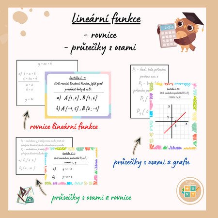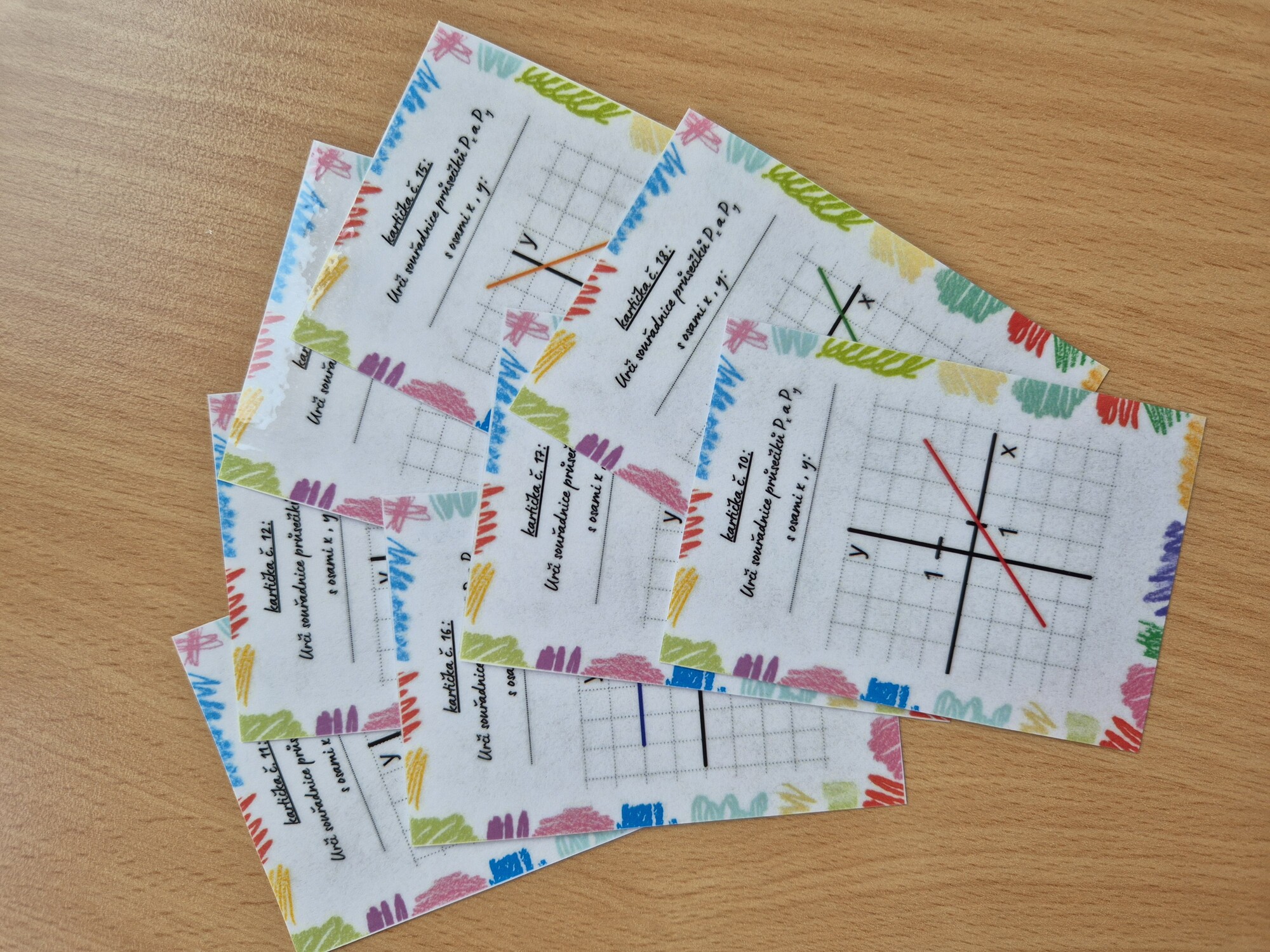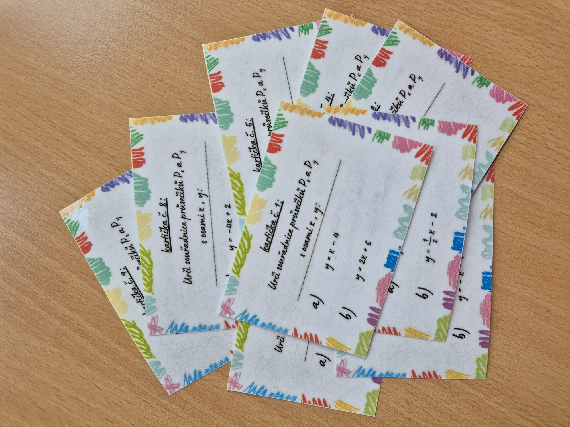 - žáci určují průsečíky s osami z rovnice (str. 5 a 6 - 9 kartiček s 18 příklady) nebo z grafu (str. 7 a 8 - 9 kartiček s 9 příklady)