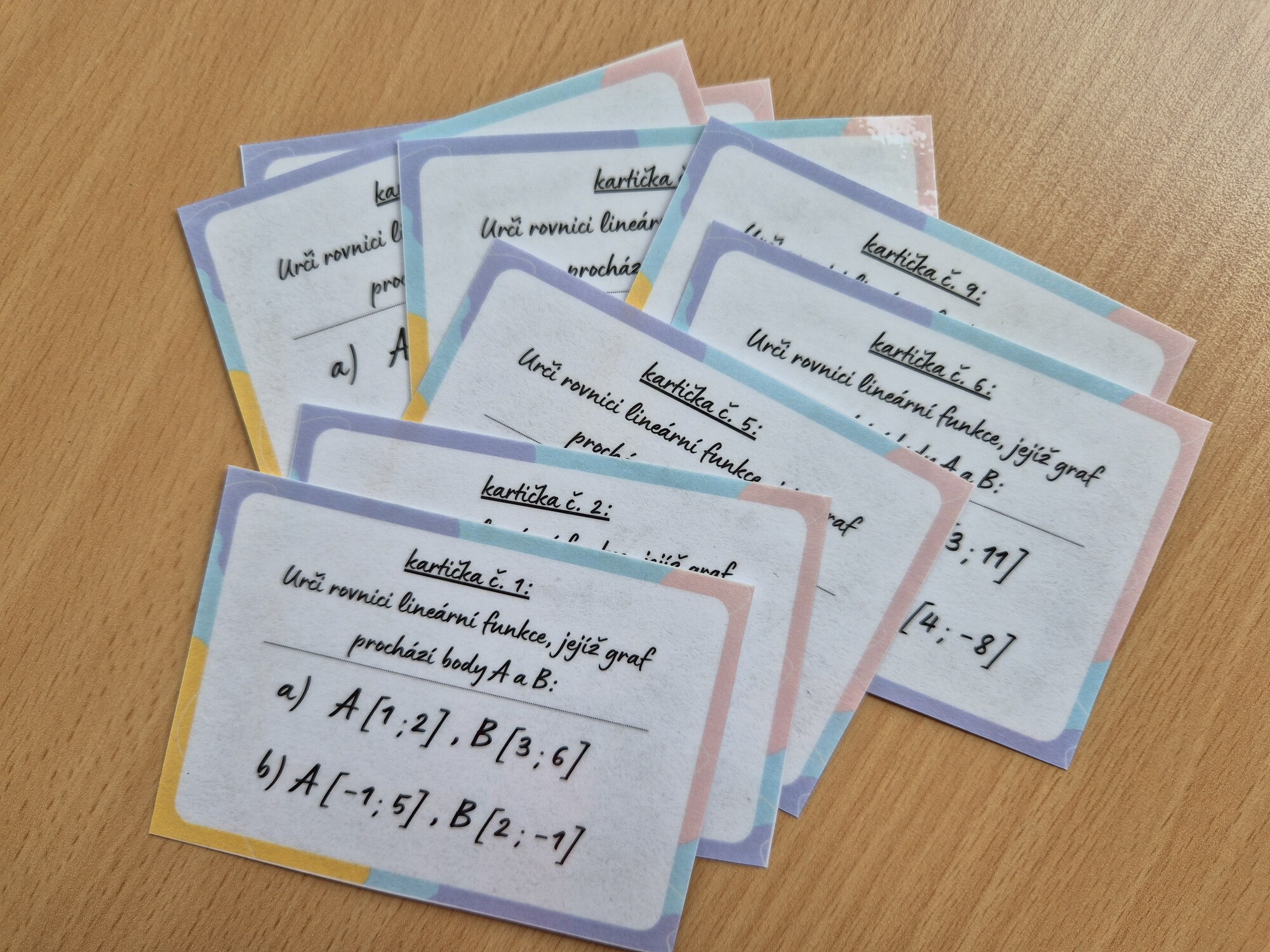 - žáci určují rovnici lineární funkce (str. 3 a 4) - materiál obsahuje 9 kartiček s 18 příklady