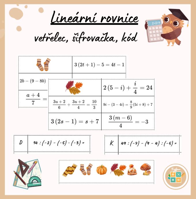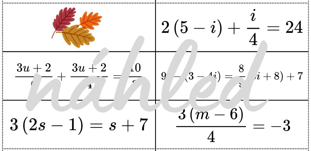 - žáci mají 6 kartiček, na každé je jiný obrázek (šála, ponožky, dýně, listí, čepice a houba) a 5 lineárních rovnic s jednou neznámou