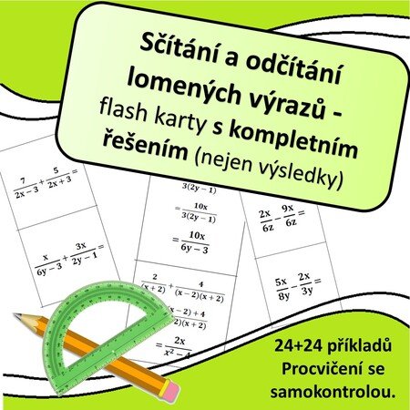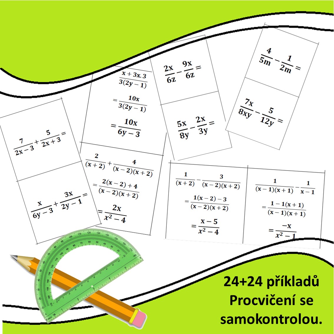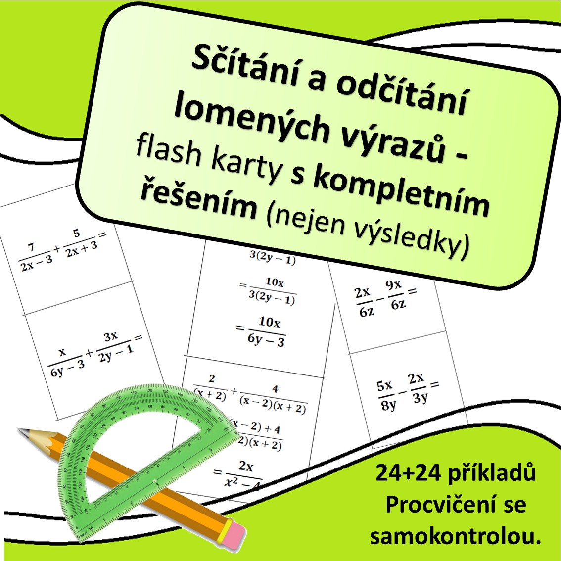 Materiál je určen pro žáky 9. třídy k samostatnému procvičení sčítání a odčítání lomených výrazů. Na kartách je z jedné strany příklad a z druhé strany je kompletní výpočet, nikoli jen výsledek.