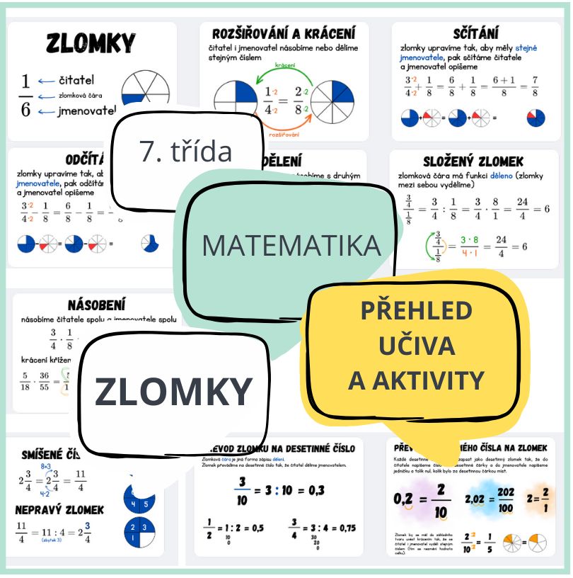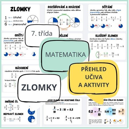 Materiál obsahuje 10 stran s přehledem učiva o zlomcích 7. třídy. Dá se vytisknout na jednotlivé A3 a pověsit do třídy. Nebo při tisku více stran na A4 jako ucelený přehled pro jednotlivé žáky.