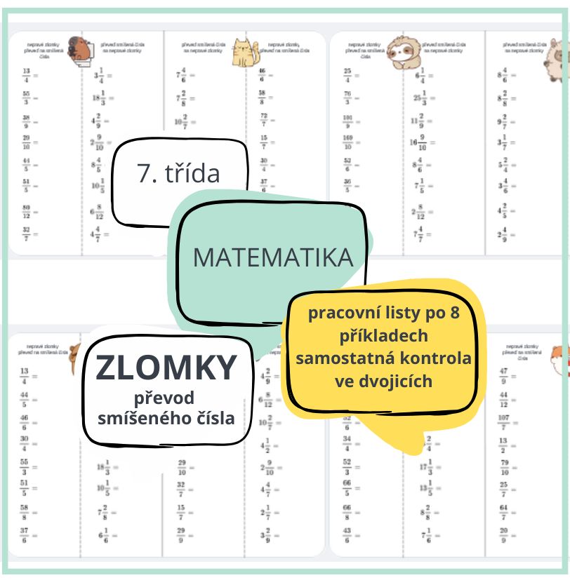 Dále obsahuje pracovní listy pro 12 dvojic na převod smíšeného čísla na nepravý zlomek a naopak.