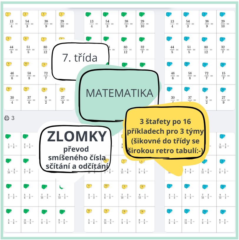 Štafety jsou 3: převod nepravého zlomku na smíšené číslo, převod smíšeného čísla na nepravý zlomek, sčítání a odčítání zlomků.