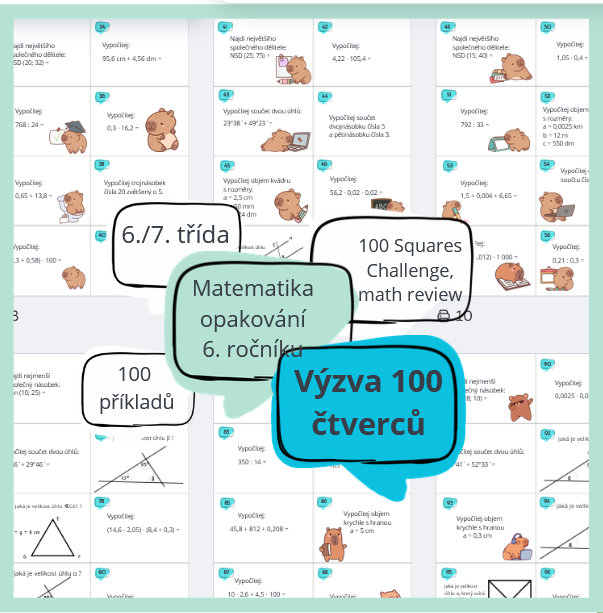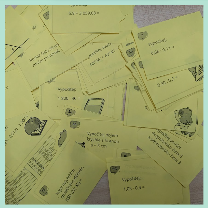 Karty obsahují učivo matematiky 6. třídy ZŠ (počítání s desetinnými čísly, dělitelnost, úhly, povrch a objem krychle a kvádru). Hodí se na konec šesté či začátek sedmé třídy. Hru tvoří 100 karet (příkladů) a je určena na celou vyučovací hodinu.
