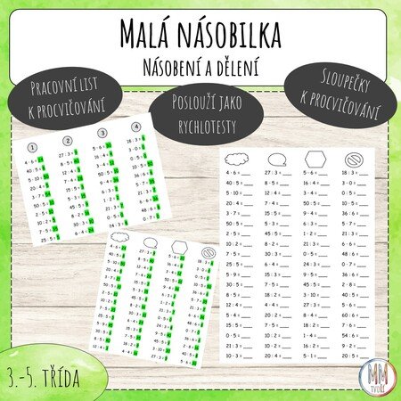 Materiál obsahuje sloupečky a pracovní list určené k procvičování násobení a dělení v oboru malé násobilky. Oboustranný pracovní list obsahuje 16 verzí počítání, k okamžitému tisku je zde pak dalších 20 verzí. Možno použít jako testy, či podklady k matematickým hrám. Součástí materiálu je i správné řešení použitelné i jako samokontrola.