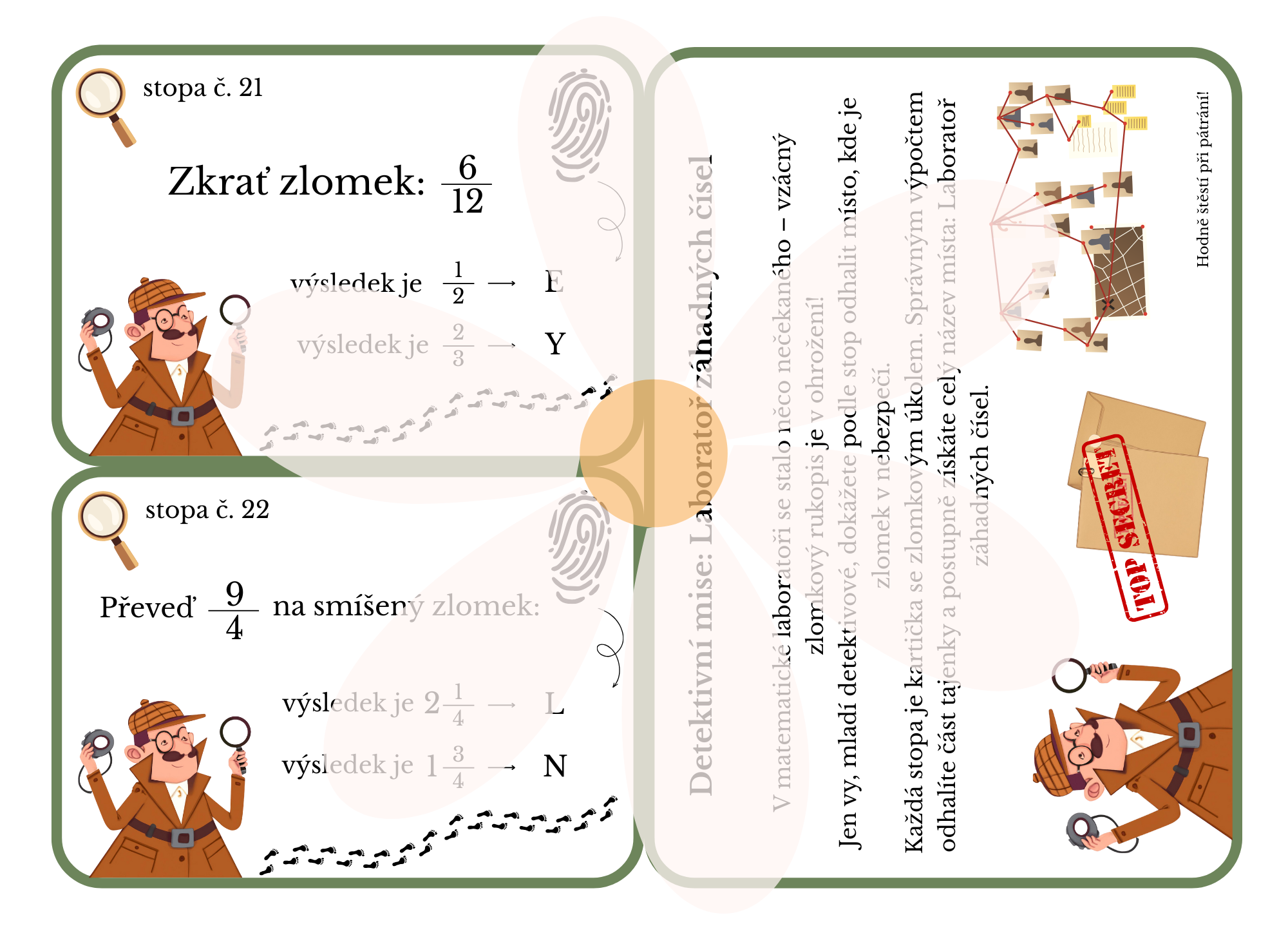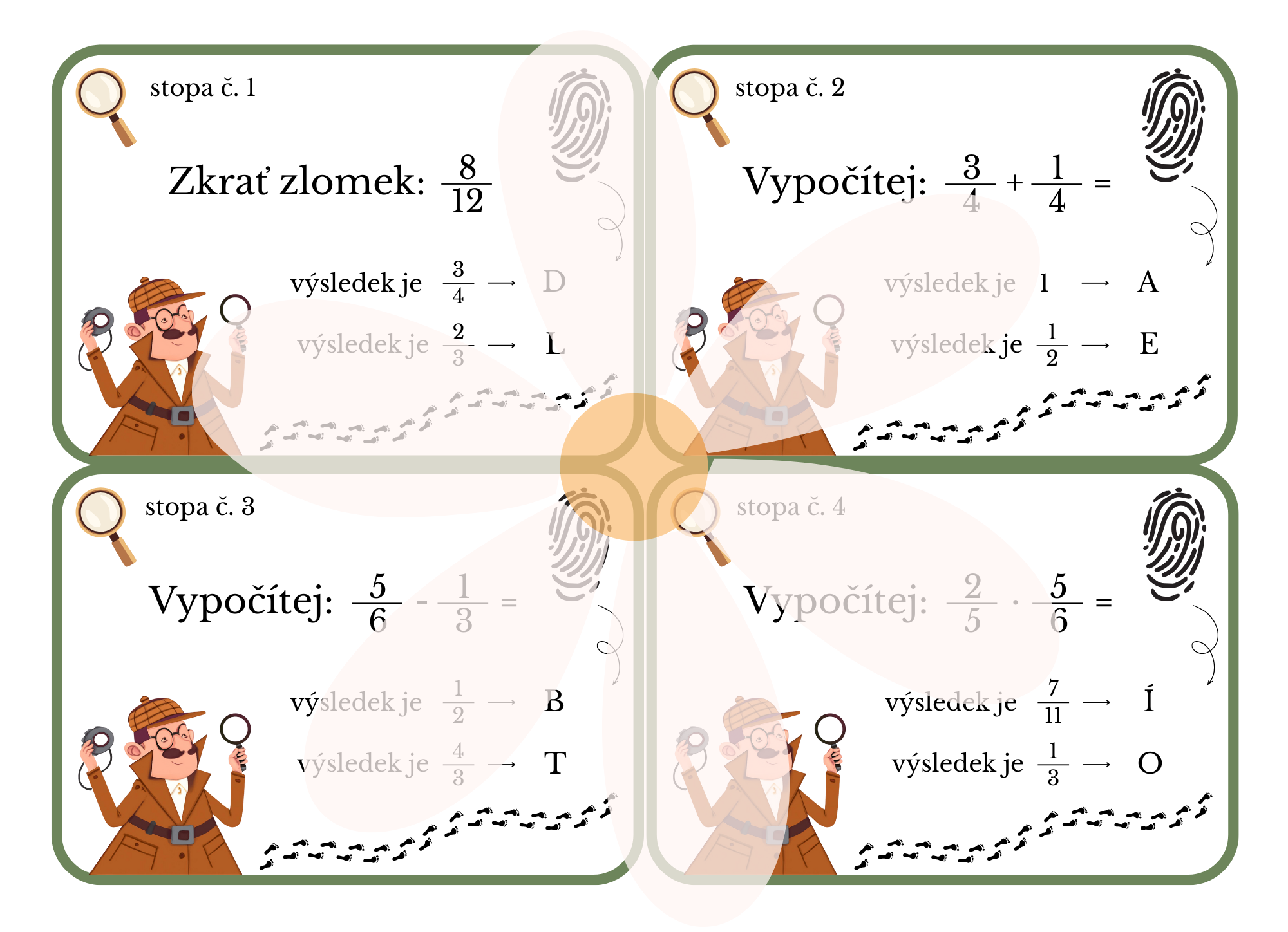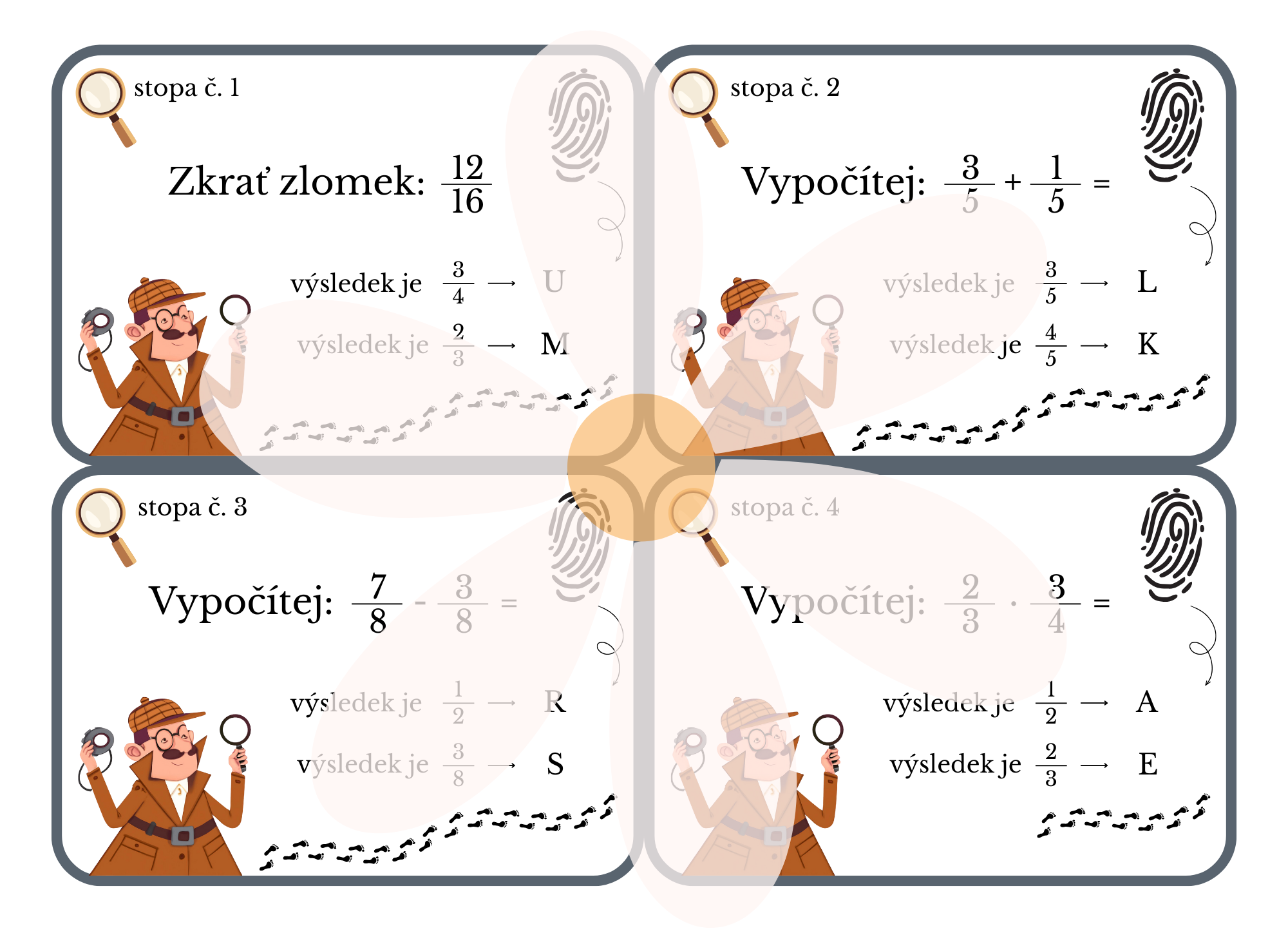 detektivním příběhu, v němž žáci postupně řeší kartičky s příklady a díky