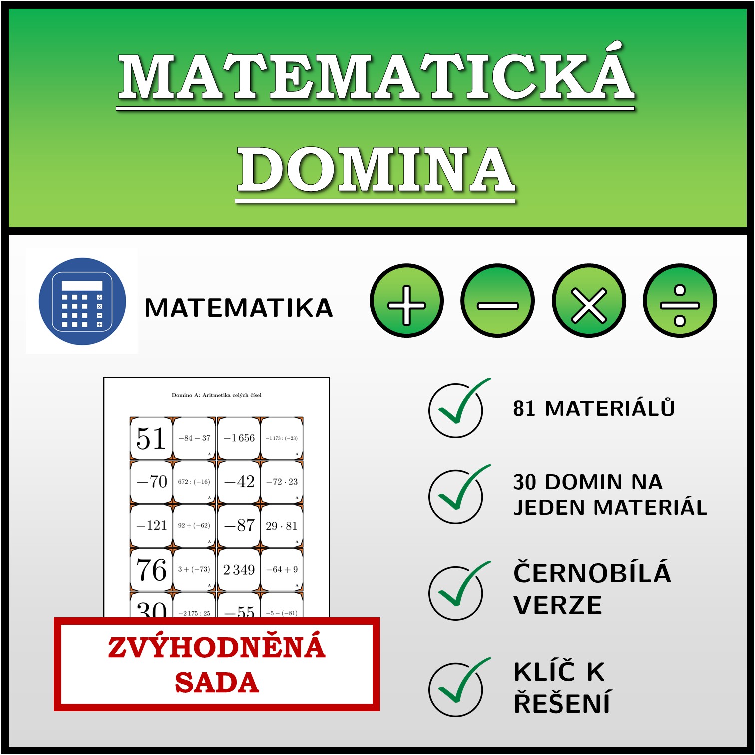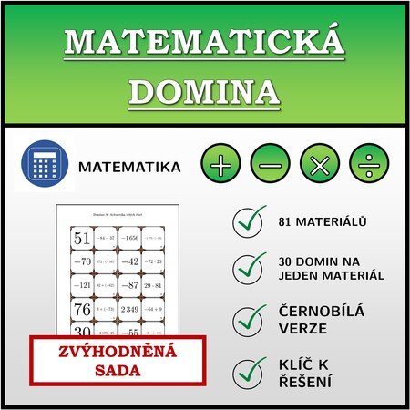 Zvýhodněná sada obsahuje 81 výukových domino materiálů z matematiky pro první i druhý stupeň.