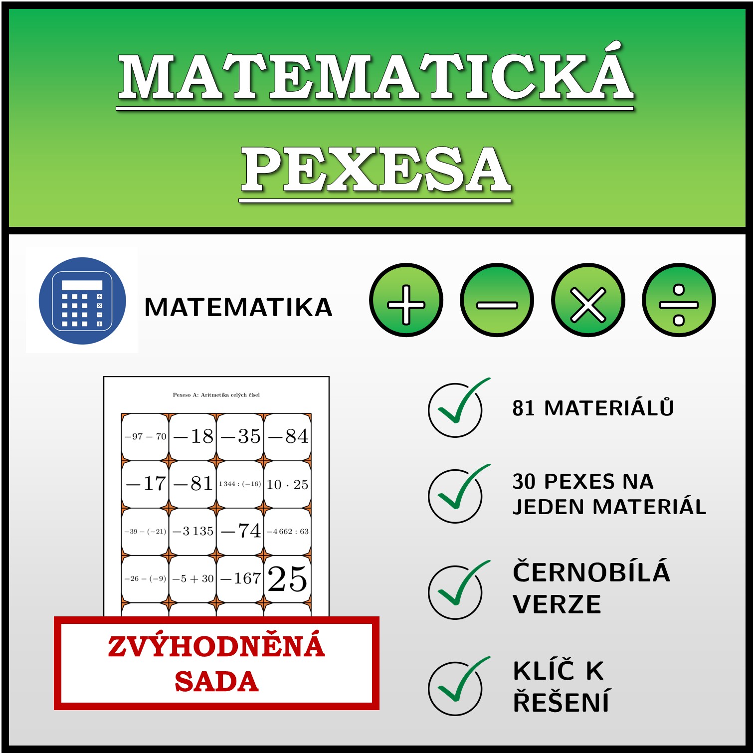 Zvýhodněná sada obsahuje 81 výukových pexeso materiálů z matematiky pro první i druhý stupeň.