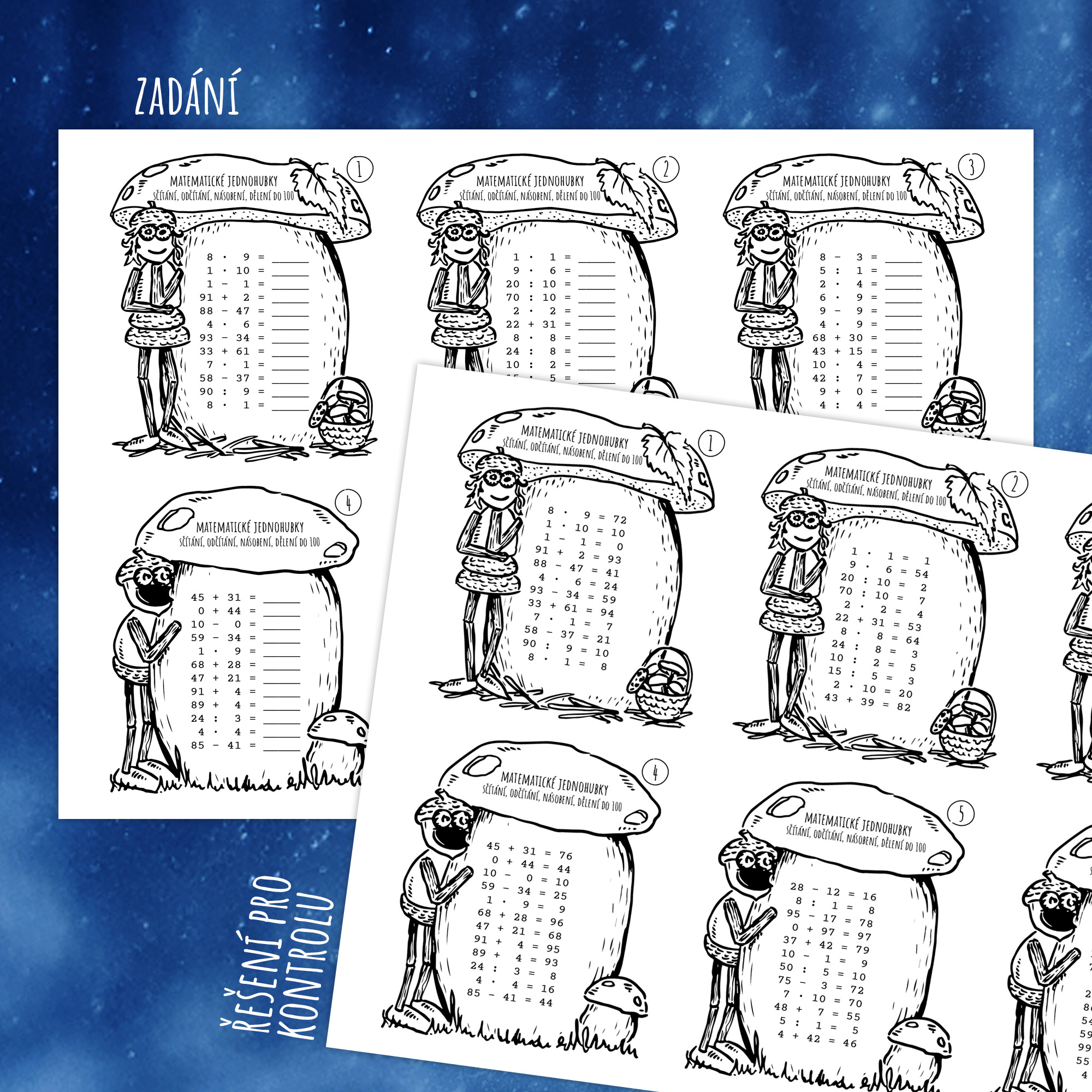 Po vypočítání příkladů si děti mohou vybarvit velkou houbu s dubánkem nebo duběnkou, která je na pozadí kartičky – práce tak získává herní a relaxační rozměr a děti jsou přirozeně motivovány k dokončení úkolu. Velkou výhodou materiálu je možnost samostatné kontroly výsledků – ke každé kartičce existuje odpovídající kartička s řešením. Kartičky jsou číslované, takže děti snadno najdou správné řešení a mohou si ověřit svou práci bez nutnosti neustálé kontroly učitelem. Materiál tak podporuje samostatnost, sebehodnocení i odpovědnost za vlastní učení.
