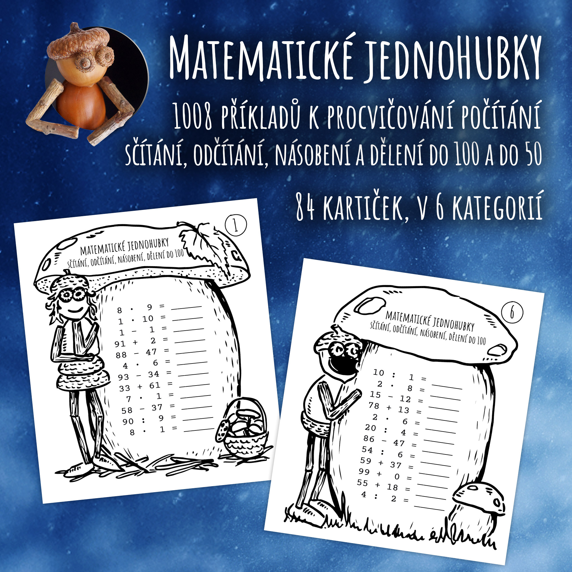 Matematické jednoHUBKY jsou hravým matematickým materiálem určeným k procvičování početních operací do 50 a do 100. Práce s kartičkami je jednoduchá a přehledná – každá kartička obsahuje 12 příkladů stejného typu a jasně uvedený popis, o jaké příklady se jedná. Děti mohou kartičku řešit samostatně, ve dvojici i ve skupině, ve škole i doma, při běžné výuce, v centrech aktivit, jako rychlovku, opakování nebo práci navíc pro rychlejší žáky.
