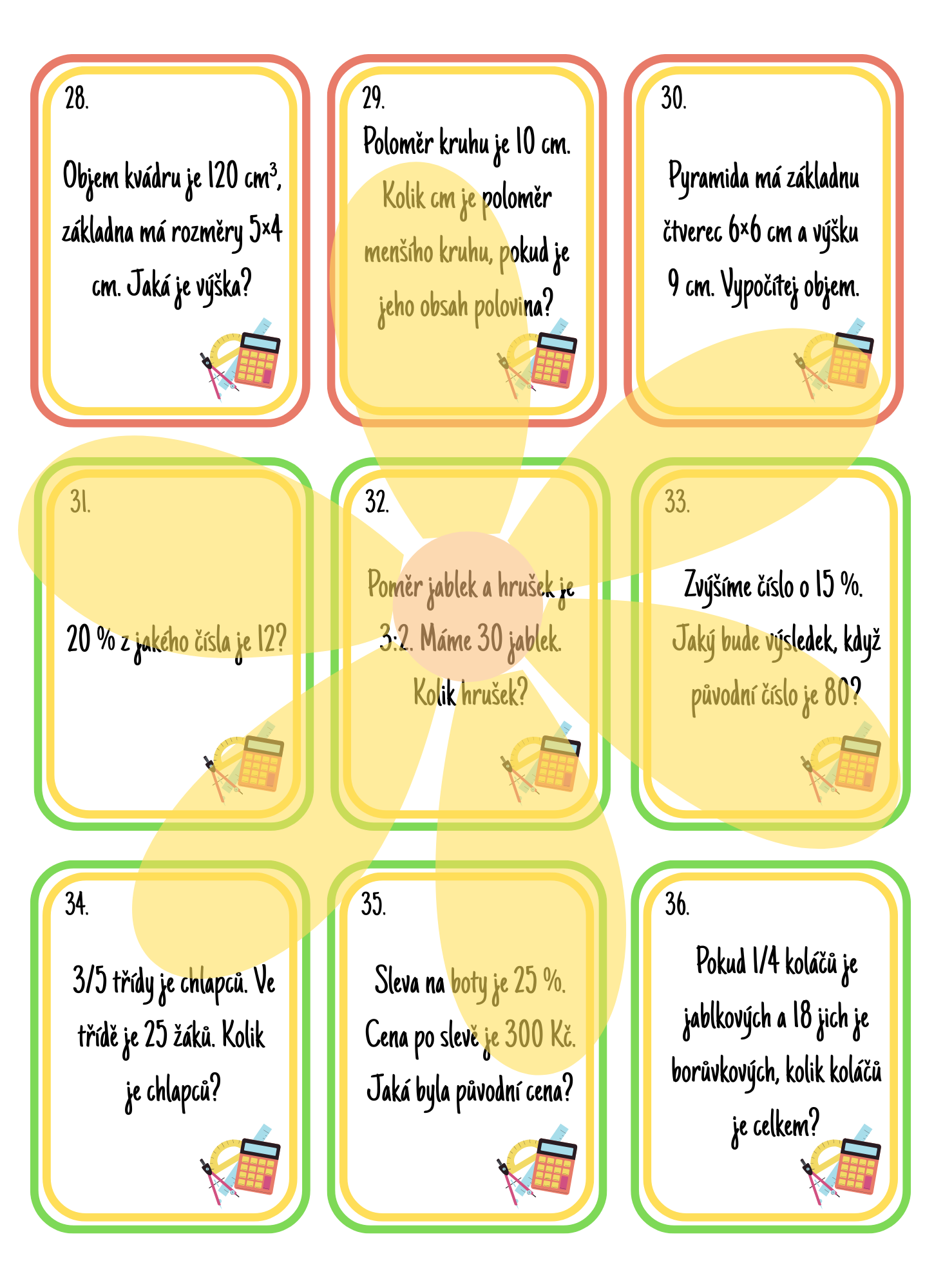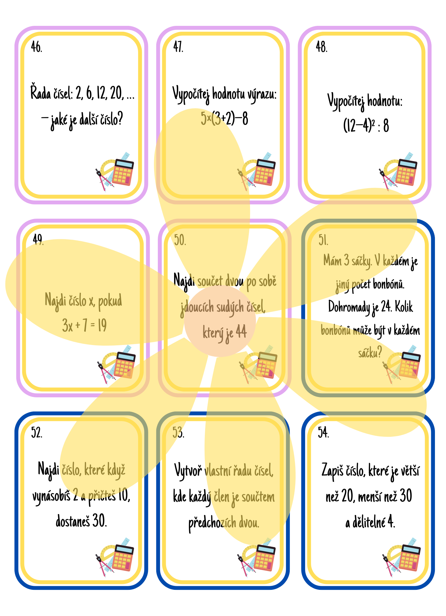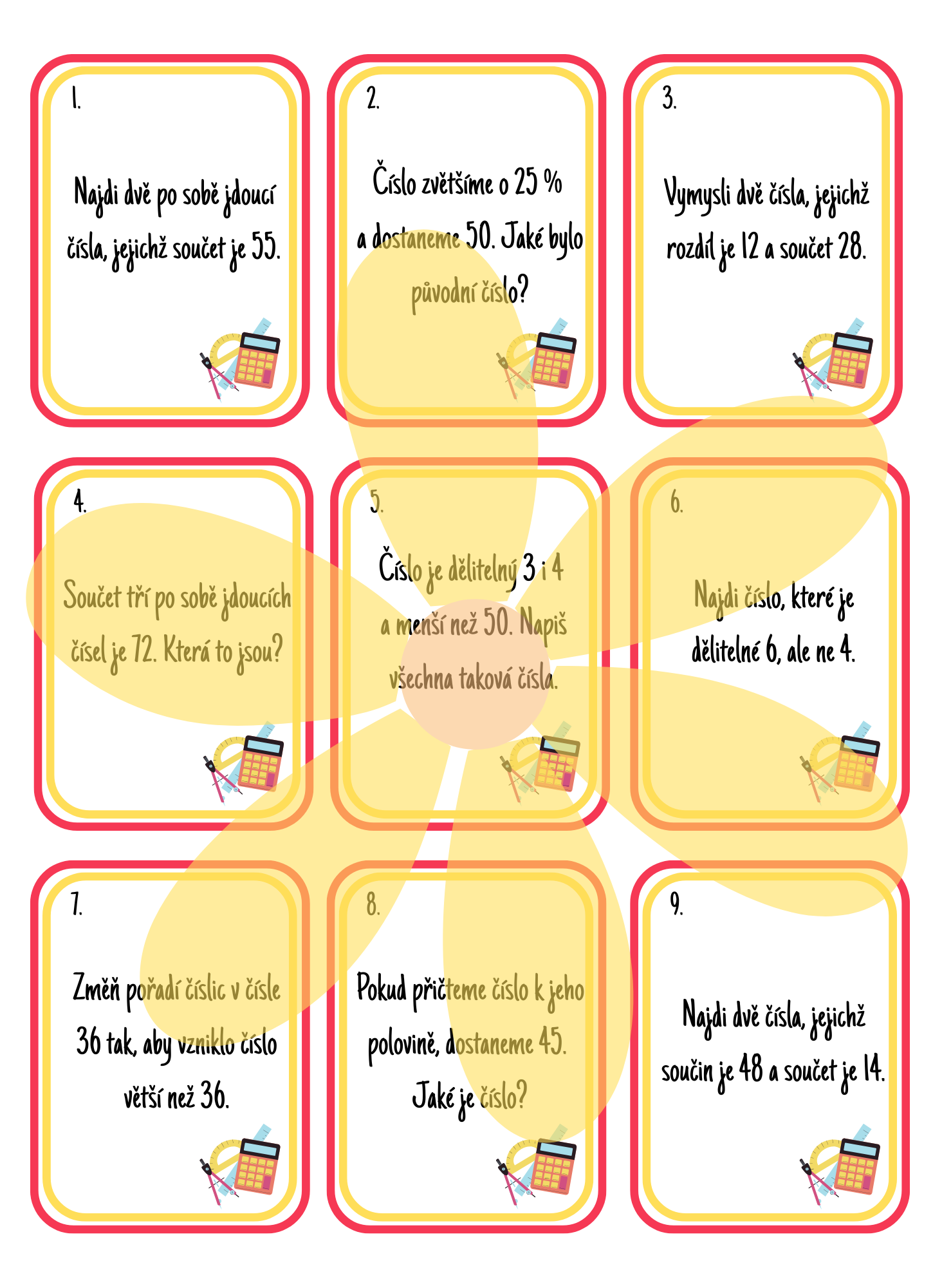 krátké „mozkové rozcvičky“ na začátku či konci hodiny, skupinové aktivity k rozvoji logického myšlení, doplňkový materiál pro nadané žáky, nebo zábavné opakování matematiky netradiční formou.