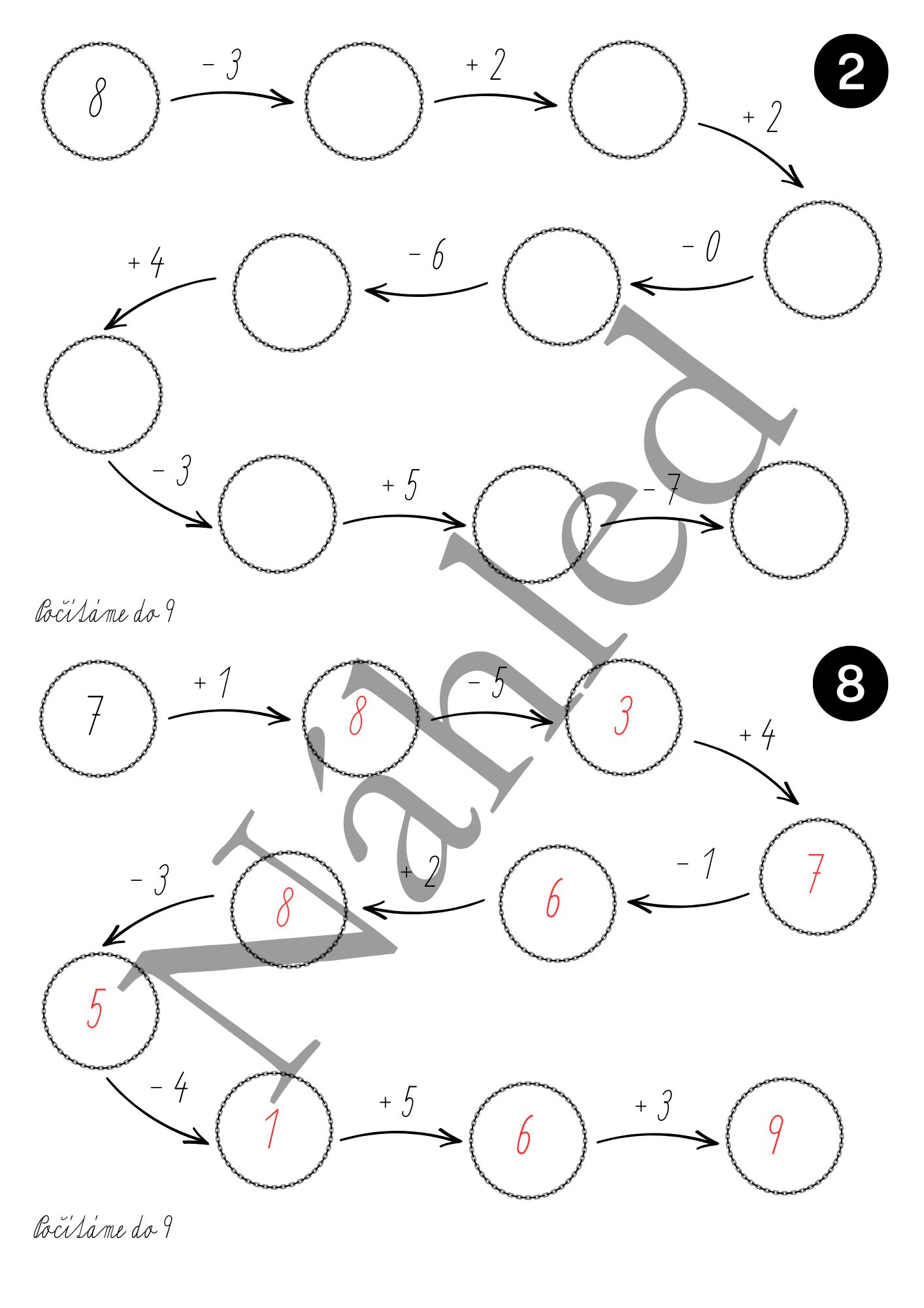 Materiál je určen žákům 1. ročníku ZŠ nebo dětem ze speciálních tříd a slouží k upevnění a procvičení učiva počítání do 9. Zaměřuje se na rozvoj základních početních dovedností – sčítání a odčítání v oboru do 9.