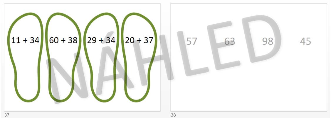 Žáci si ze stop vytvoří cestu. Jeden z nich začíná na jejím začátku vypočítáním příkladu na první stopě. Pokud počítá správně, posouvá se dál. V opačném případě záleží na Vašich pravidlech - žák může počítat znovu, musí se vyměnit s dalším žákem, musí přidat další stopy do cesty apod.