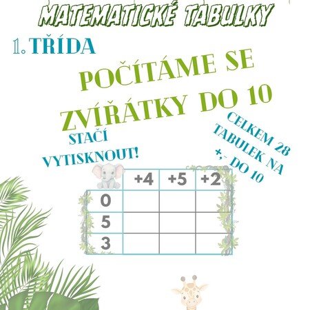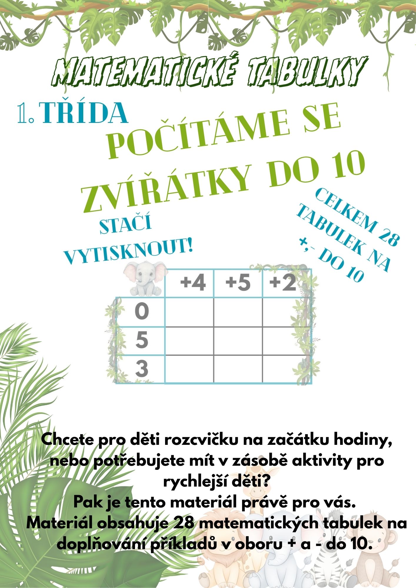 Materiál obsahuje 28 tabulek na procvičování příkladů + a - do 10. Najdete zde nepřeberné množství příkladů, které skvěle poslouží jako rozcvička na začátek hodiny, samostatná práce, nebo práce pro rychlejší děti.