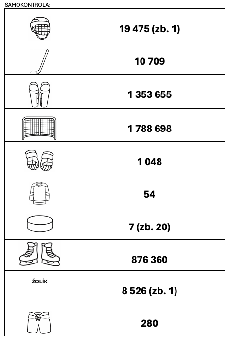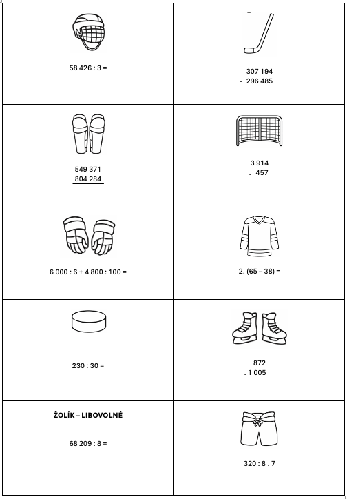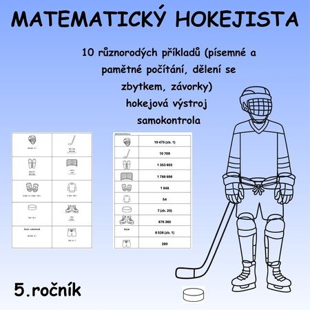 Materiál obsahuje 10 různorodých příkladů. Žáci si postupně vybírají, jakou část hokejové výstroje chtějí získat (vybarvit či dokreslit - 2 varianty). Po vypočítání si zkontrolují výsledek pomocí samokontroly. Pokud počítali správně, výstroj si vybarví či dokreslí.