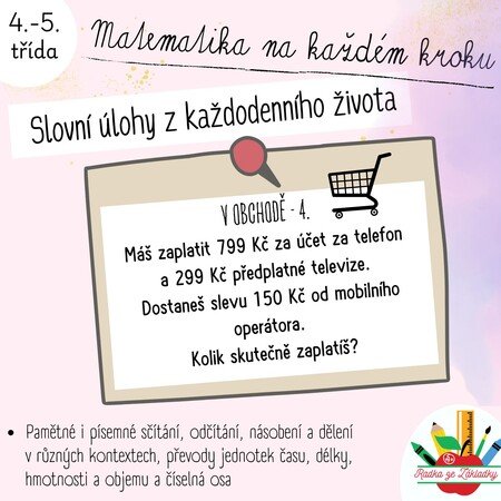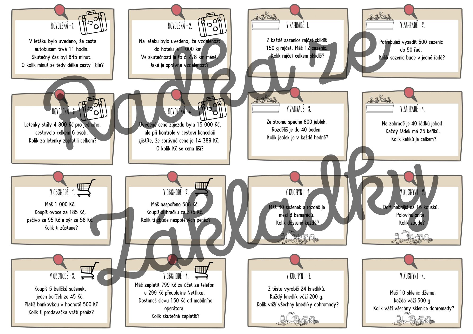 - Reálné situace: Úlohy jsou přizpůsobeny každodenním situacím, což žákům usnadňuje pochopení významu matematiky v běžném životě.