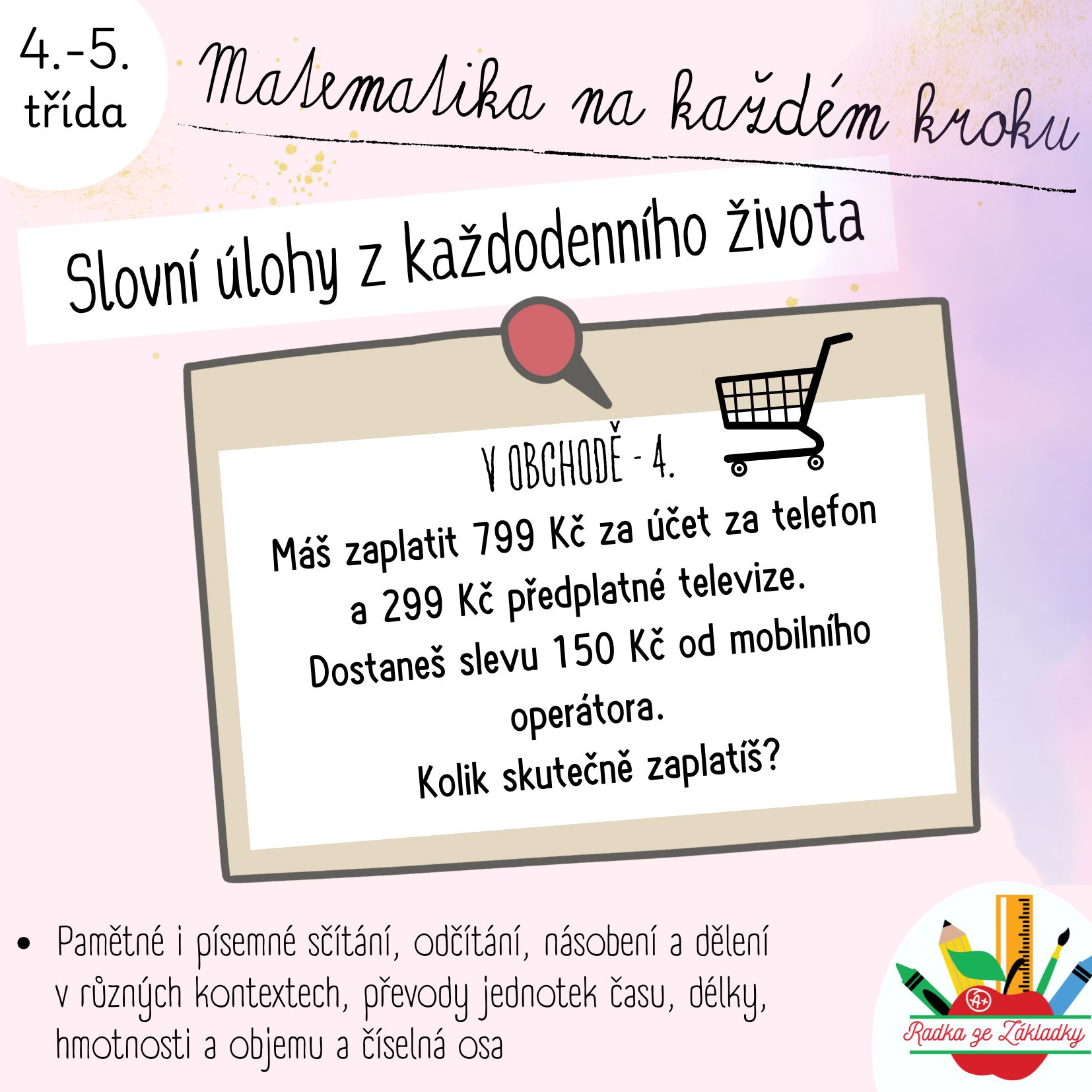 - V obchodě: Sčítání, odčítání, násobení, práce s penězi.