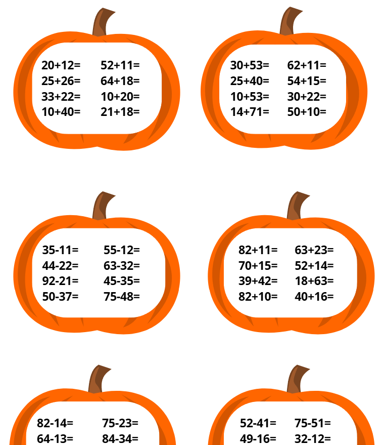 Soubor pro halloweenské počítání do 100 obsahuje 4 velké dýně s příklady, jednu stránku s výsledky a dvě stránky s malými dýněmi pro individuální práci dětí. Nejvhodnější je materiál vytisknout, velké dýně a výsledky zalaminovat a doplnit suchým zipem, aby děti mohly vypočítat příklad a přiřadit k němu správný výsledek. Malé dýně je možné nakopírovat a rozdat dětem v rámci individuálního procvičování.