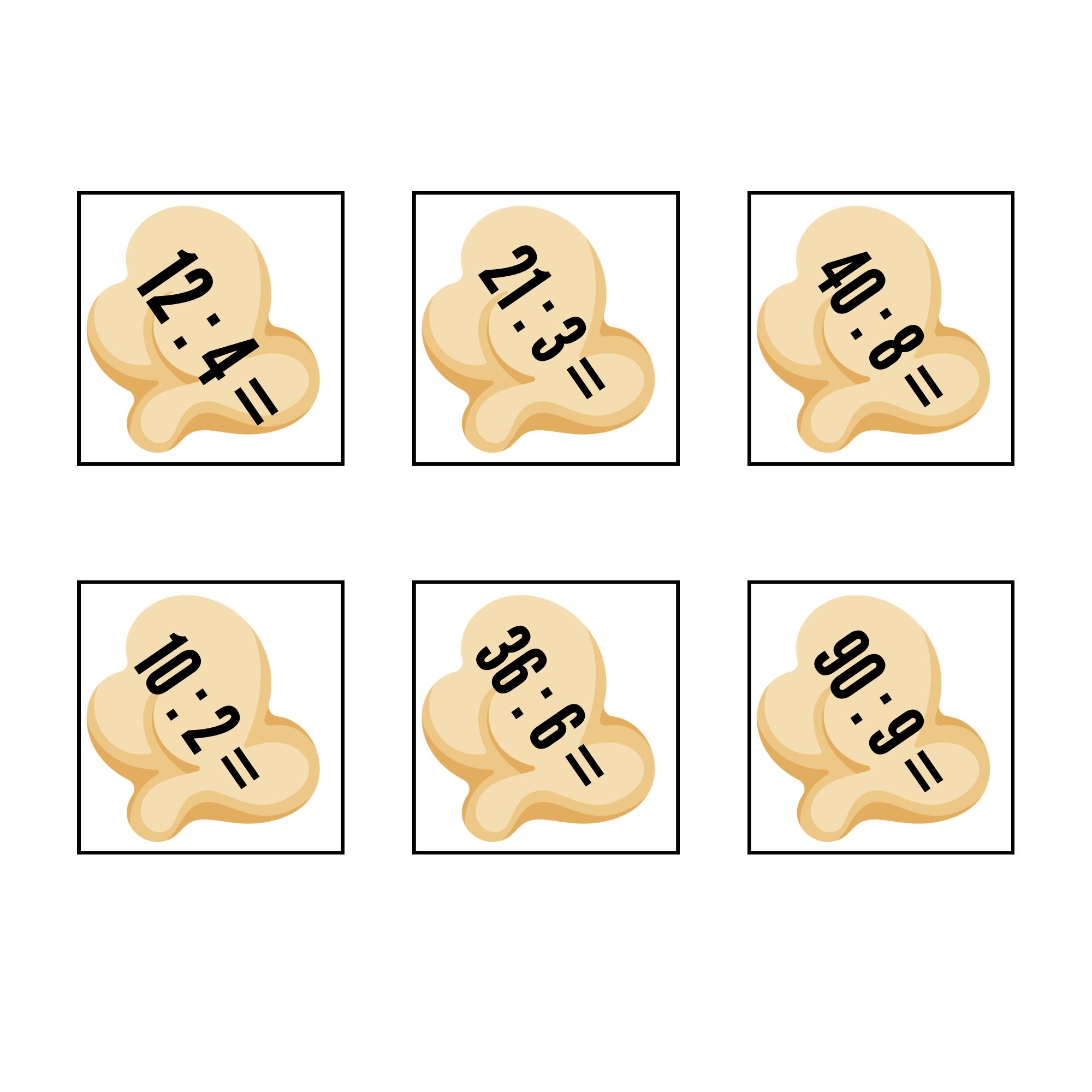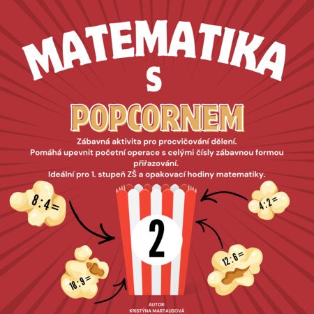 Děti pracují s nádobou na popcorn, na které je napsán výsledek (např. 2). Jejich úkolem je najít a přiřadit všechny zrnka popcornu, které obsahují příklady dělení se stejným výsledkem (např. 8:4= nebo 12:6=).