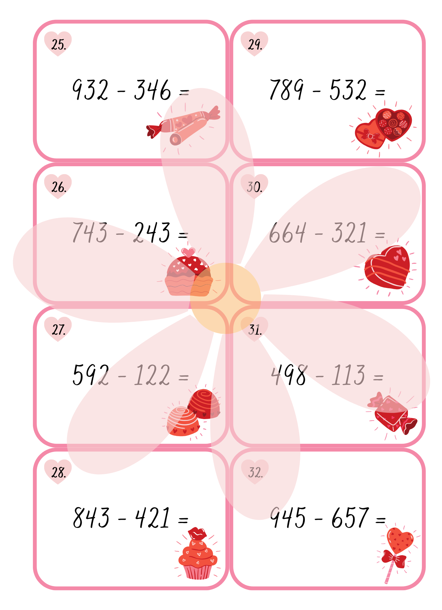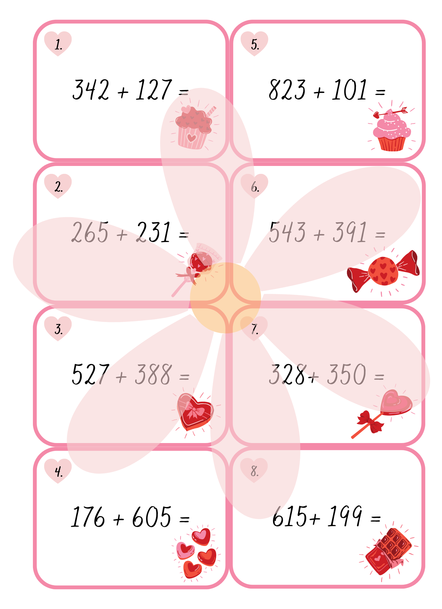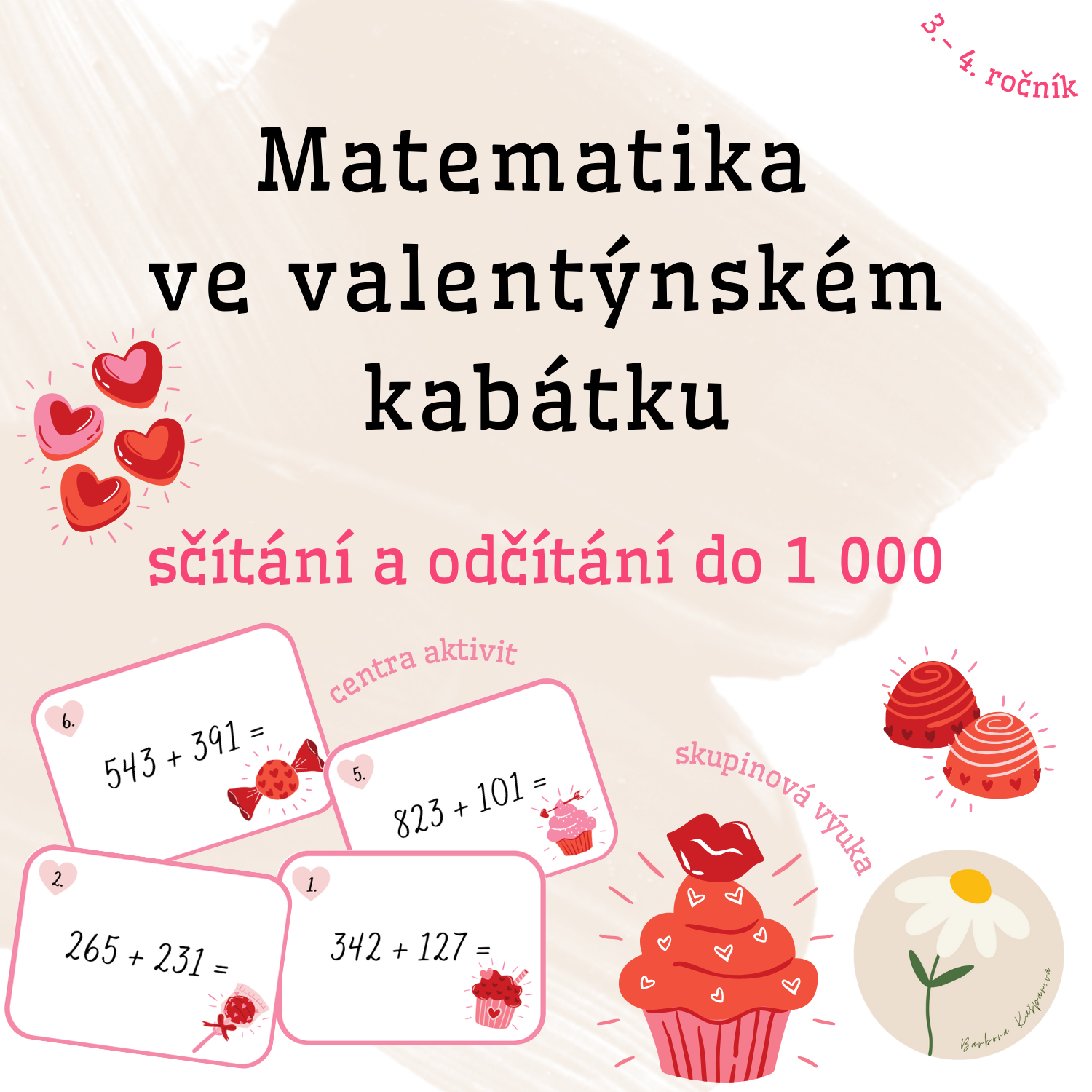 Tento valentýnský matematický materiál slouží k procvičování sčítání a odčítání do 1 000 hravou a motivační formou. Kartičky jsou určené především pro žáky 3.–4. ročníku základní školy a podporují upevnění početních dovedností, práci s čísly a rozvoj matematického myšlení.