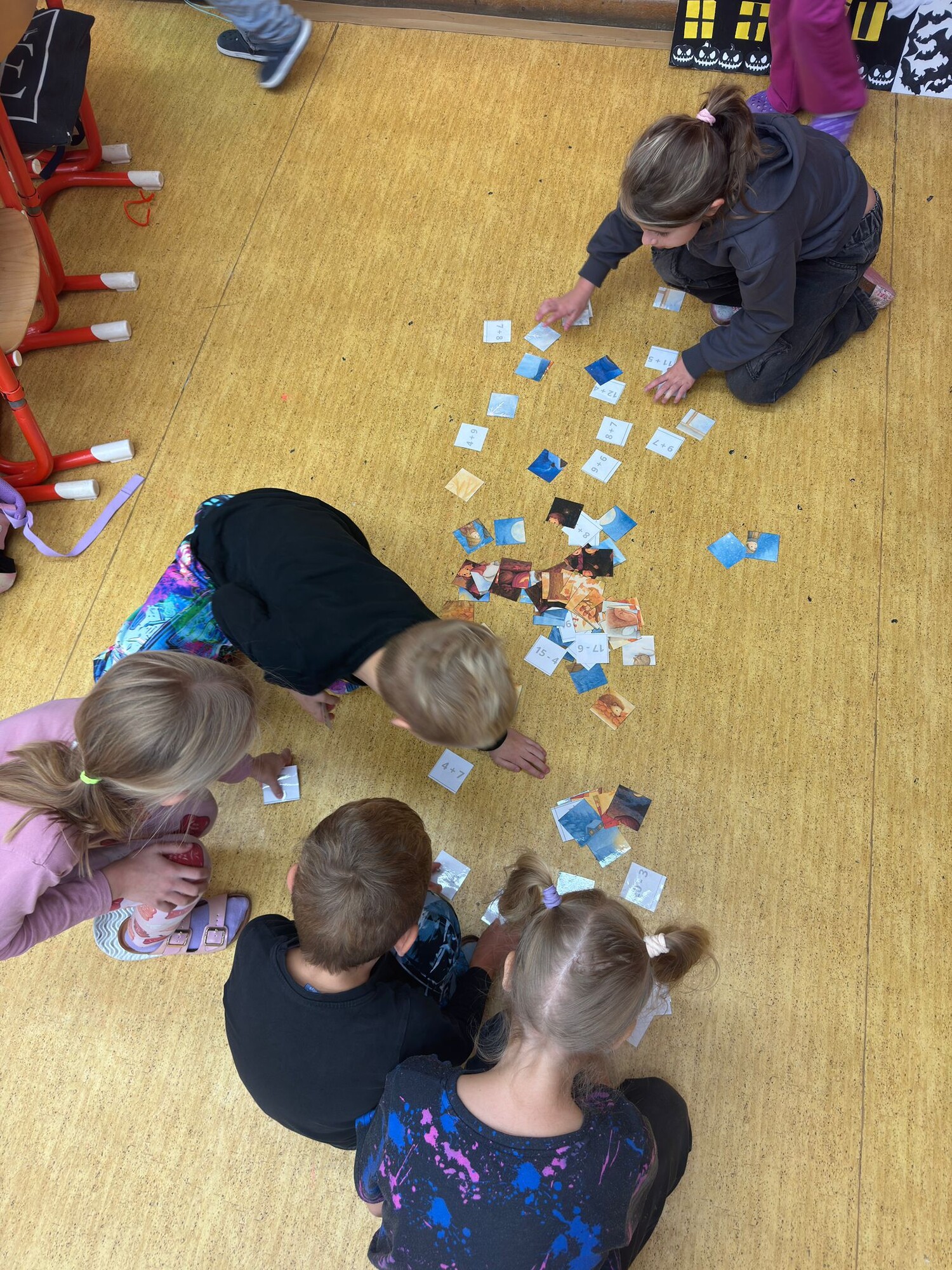 Děti se po třídě pohybují, hledají dýně, počítají a nosí je ke stromům s odpovídajícím výsledkem.