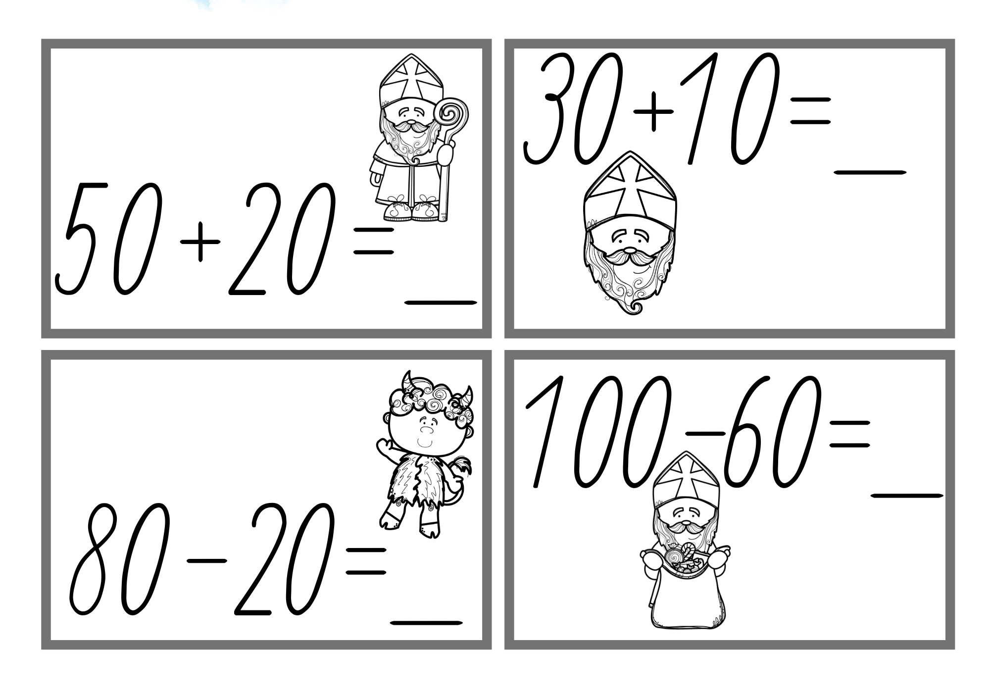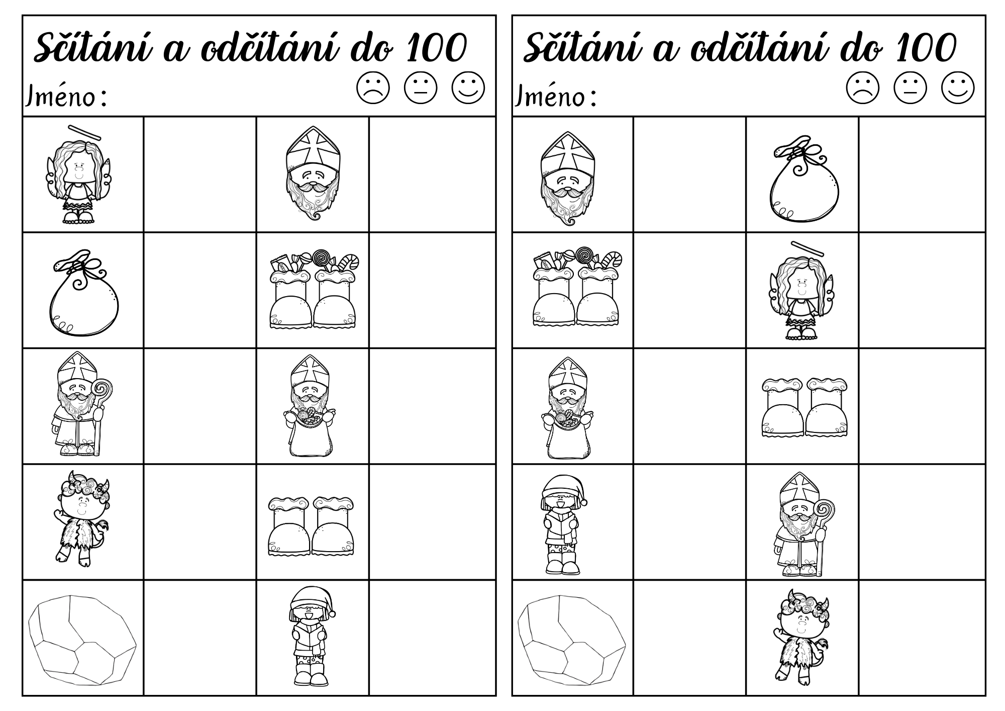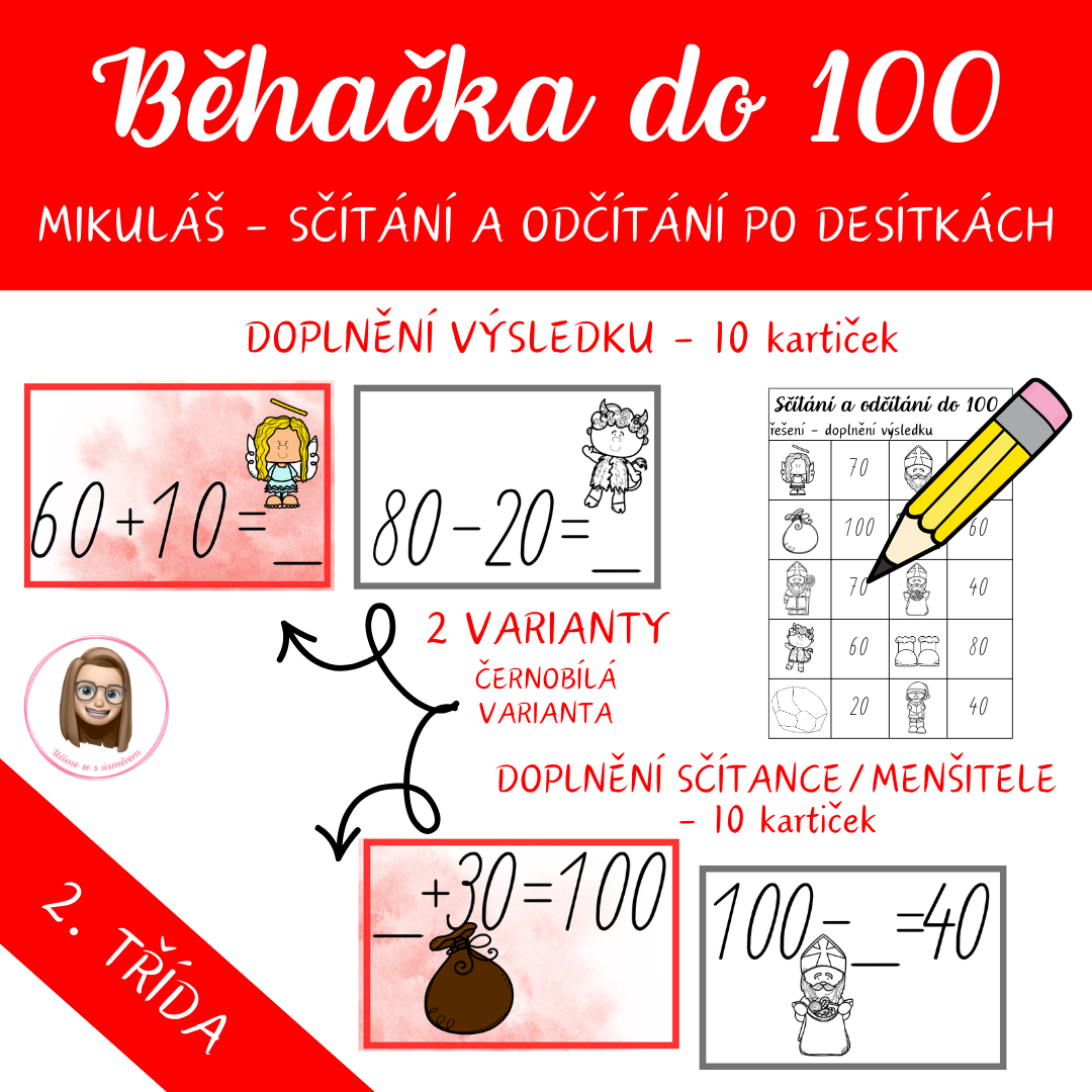 Mikulášská běhačka je hravý materiál, se kterým si děti procvičí sčítání a odčítání po desítkách do 100. Soubor obsahuje 10 kartiček pro doplňování výsledků a 10 kartiček na doplňování chybějícího sčítance nebo menšitele.