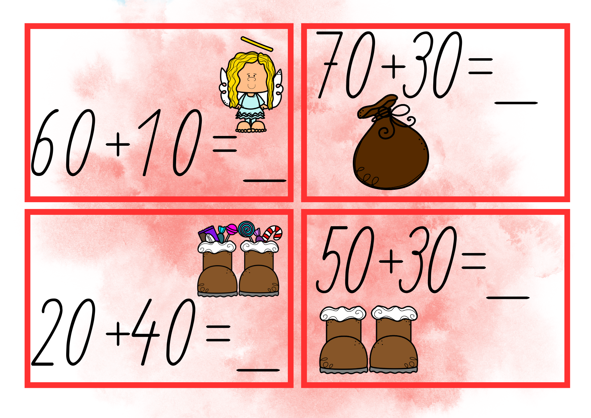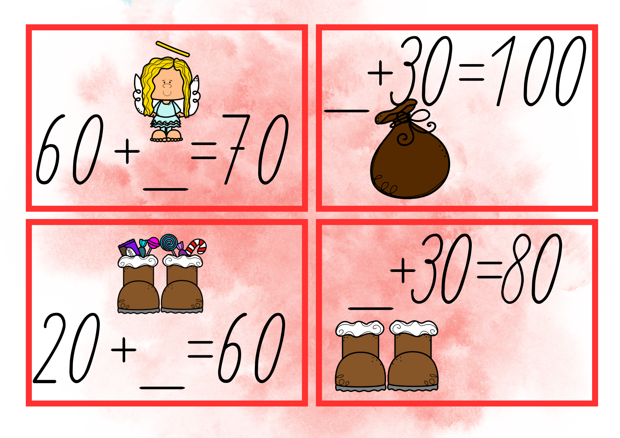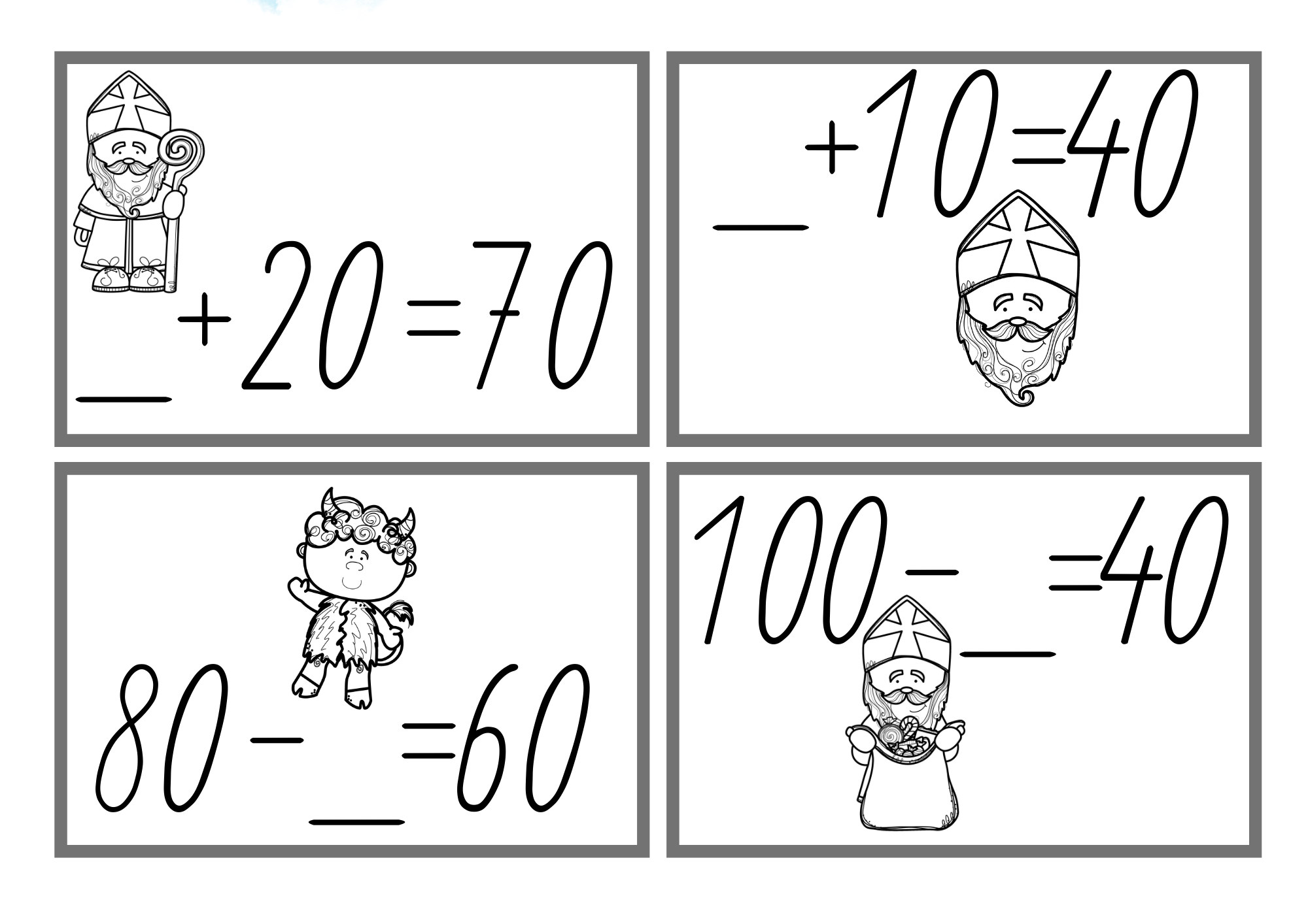 Mikulášská běhačka je hravý materiál, se kterým si děti procvičí sčítání a odčítání po desítkách do 100. Soubor obsahuje 10 kartiček pro doplňování výsledků a 10 kartiček na doplňování chybějícího sčítance nebo menšitele.