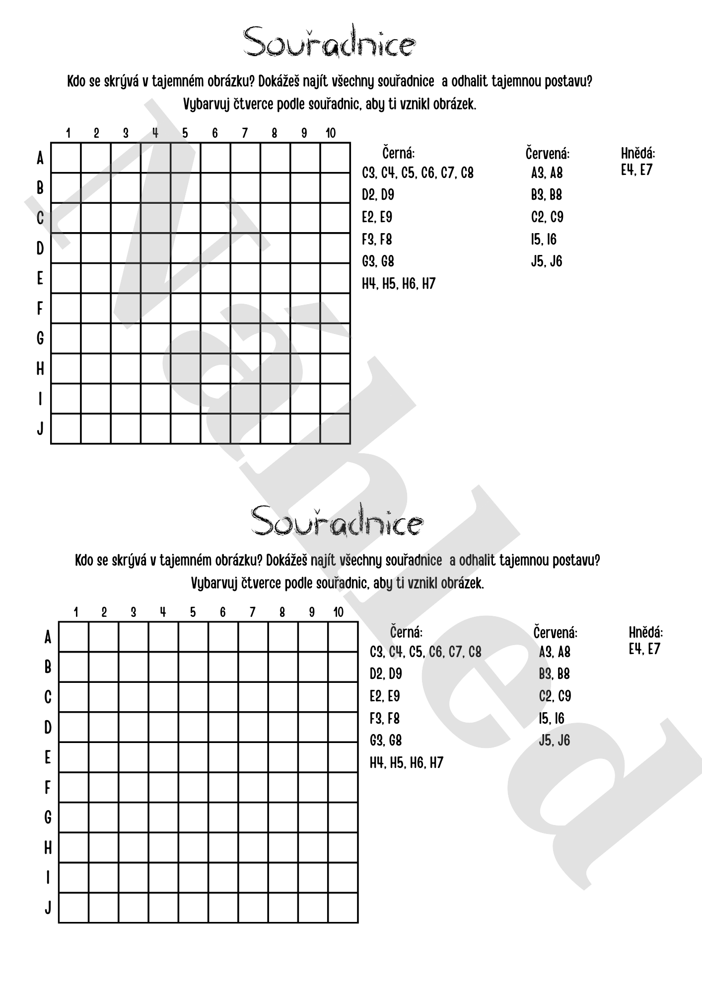 - Čertovská Geometrie: Hledání souřadnic ve čtvercové síti (10x10), které po vybarvení odhalí rastrový obrázek čerta.