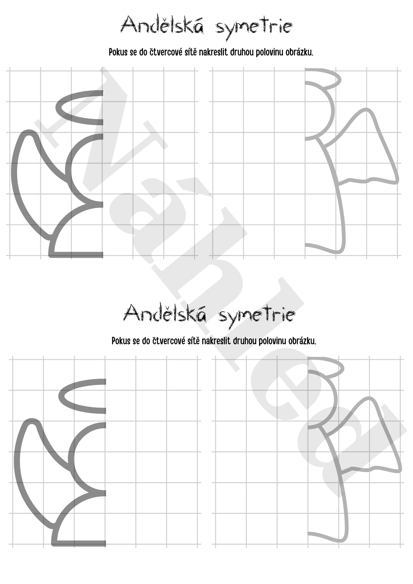 - Andělské Symetrie: Úkoly k dokreslování chybějící poloviny obrázku ve čtvercové síti, procvičující osovou souměrnost.