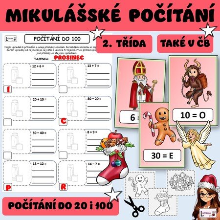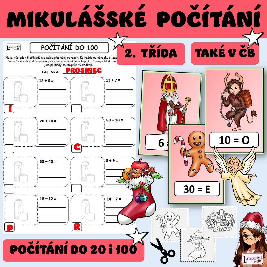 Žáci dostanou pracovní list. Žáci mají za úkol vypočítat příklady u každého čtverce a poté najít obrázek se správným výsledkem a písmenem. Obrázek si vystřihnou a nalepí k příkladu. Písmeno zapíší do rámečku pod výsledkem. Výsledky poté srovnají od nejmenšího po největší a vznikne jim tajenka. Tajenka = PROSINEC. K danému výsledku žáci vymýšlí příklad se stejným výsledkem, libovolnou početní operací, dle schopností každého žáka.