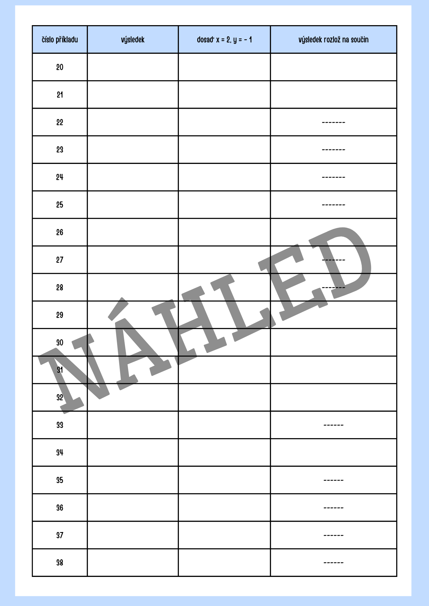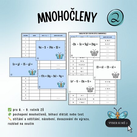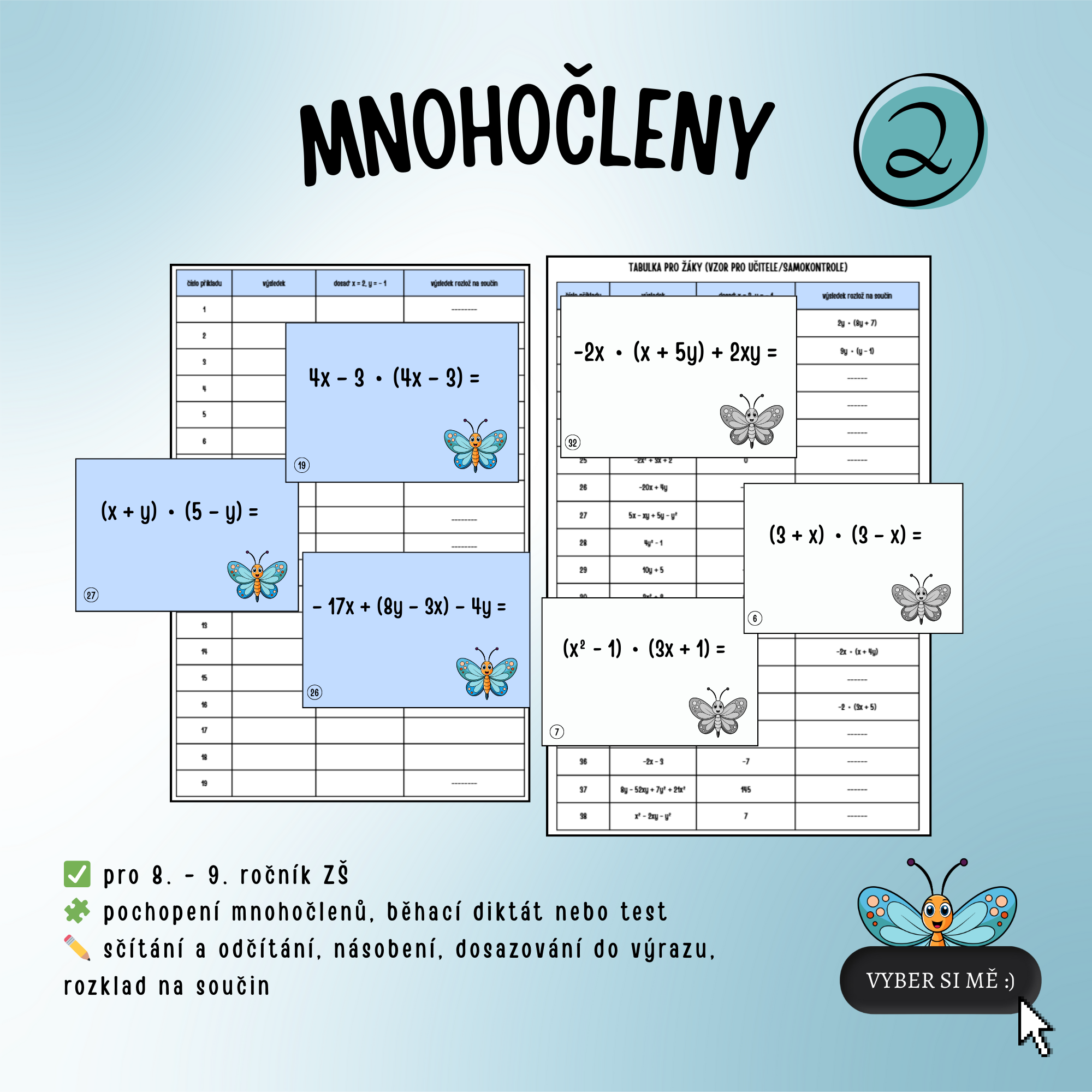 Příklady na sčítání a odčítání, násobení mnohočlenů, dosazování do výrazu a rozklad na součin.
